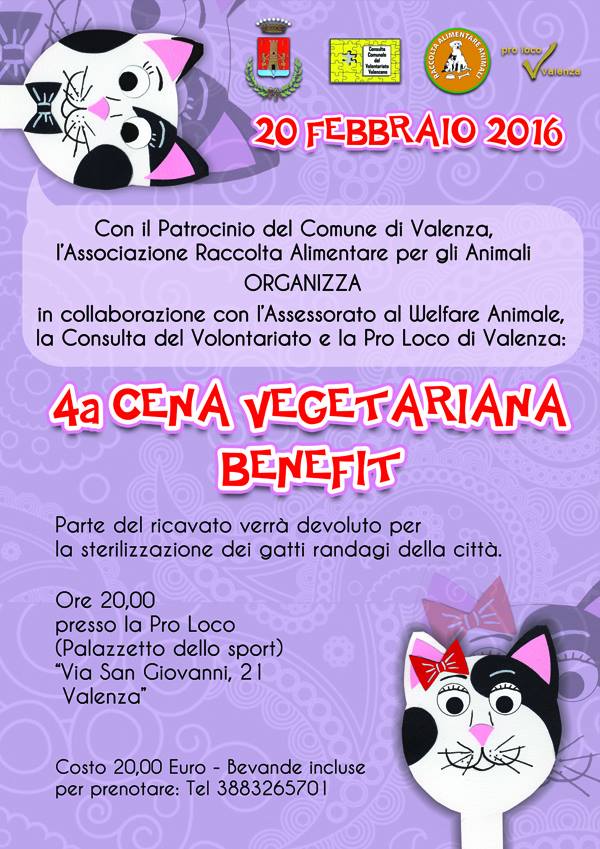 Sabato 20 febbraio con il patrocinio del comune di Valenza, l’associazione raccolta alimentare per gli animali organizza in collaborazione con l’assessorato al welfare animali, la consulta del volontariato e la pro loco di Valenza, la consueta cena vegetariana benefit….parte del ricavato sara’ devoluto per la sterilizzazione dei gatti randagi della citta’. 20,00 euro bevande incluse