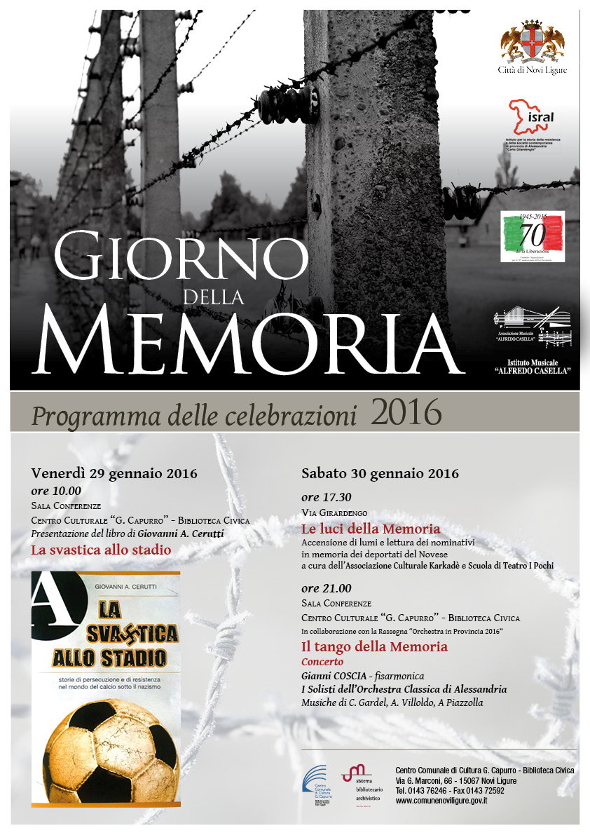 Per commemorare il Giorno della Memoria e ricordare lo sterminio del popolo ebraico durante l’ultimo conflitto mondiale, il Comune di Novi Ligure ha organizzato una serie di eventi culturali in collaborazione con Isral (Istituto Storico della Resistenza in Provincia di Alessandria) Comitato per il 70° Anniversario della Liberazione e Istituto Musicale “Alfredo Casella”. Venerdì 29 gennaio, alle ore 10, presso la Sala Conferenze della Biblioteca Civica di via Marconi 66, si terrà la presentazione del libro di Giovanni A. Cerutti “La svastica allo stadio”, storie di persecuzione e resistenza nel mondo del calcio sotto il nazismo.