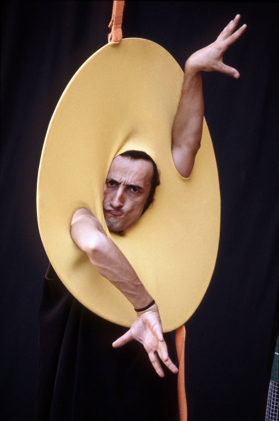 Cos’è l’Io? Un cerchio giallo consapevole di sé… un corpo tarantolato entra in scena, accolto da un tripudio di colori e stoffa. Un volto plastico riempie le fessure presenti nei teli e pronuncia parole dirette. È un’esplosione caleidoscopica di emozioni. L’armonia non esiste, la rottura è padrona. L’attore è un folletto dispettoso che prende di petto il povero spettatore, lo maltratta, gioca con lui e lo tiene sulle corde. Il corpo dell’artista, vero protagonista, assume pose plastiche, posizioni scomposte, mimica facciale che tanto ricorda buon Igor assistente di Frankenstein junior.