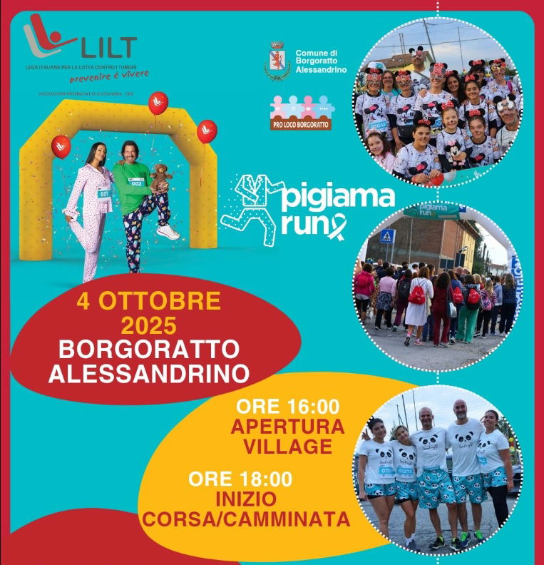 BORGORATTO – A causa del maltempo, la seconda edizione della Pigiama Run della Lilt di Alessandria è stata posticipata di qualche giorno. L’evento, inizialmente in programma venerdì 26 settembre, si svolgerà sabato 4 ottobre a Borgoratto Alessandrino, sempre con lo stesso spirito solidale: correre o camminare in pigiama per testimoniare vicinanza ai piccoli pazienti oncologici.