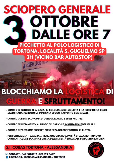 Il 3 ottobre sciopero generale del sindacato S.I. Cobas e picchetto a Tortona contro “la logistica di guerra”
