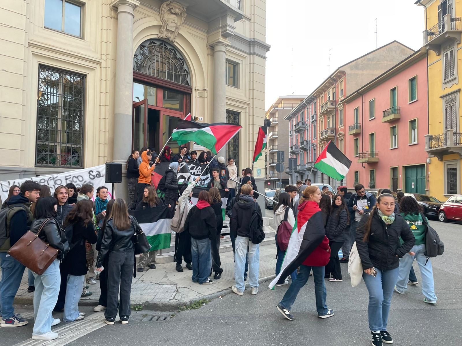 ALESSANDRIA – Anche dal mondo della scuola si alza la voce per arrivare fino a Israele. Questa mattina, alle 7.30, gli studenti del Liceo Eco, insieme a giovani arrivati da  altri istituti, hanno esposto la bandiera della Palestina e mostrato striscioni a sostegno del popolo di Gaza.