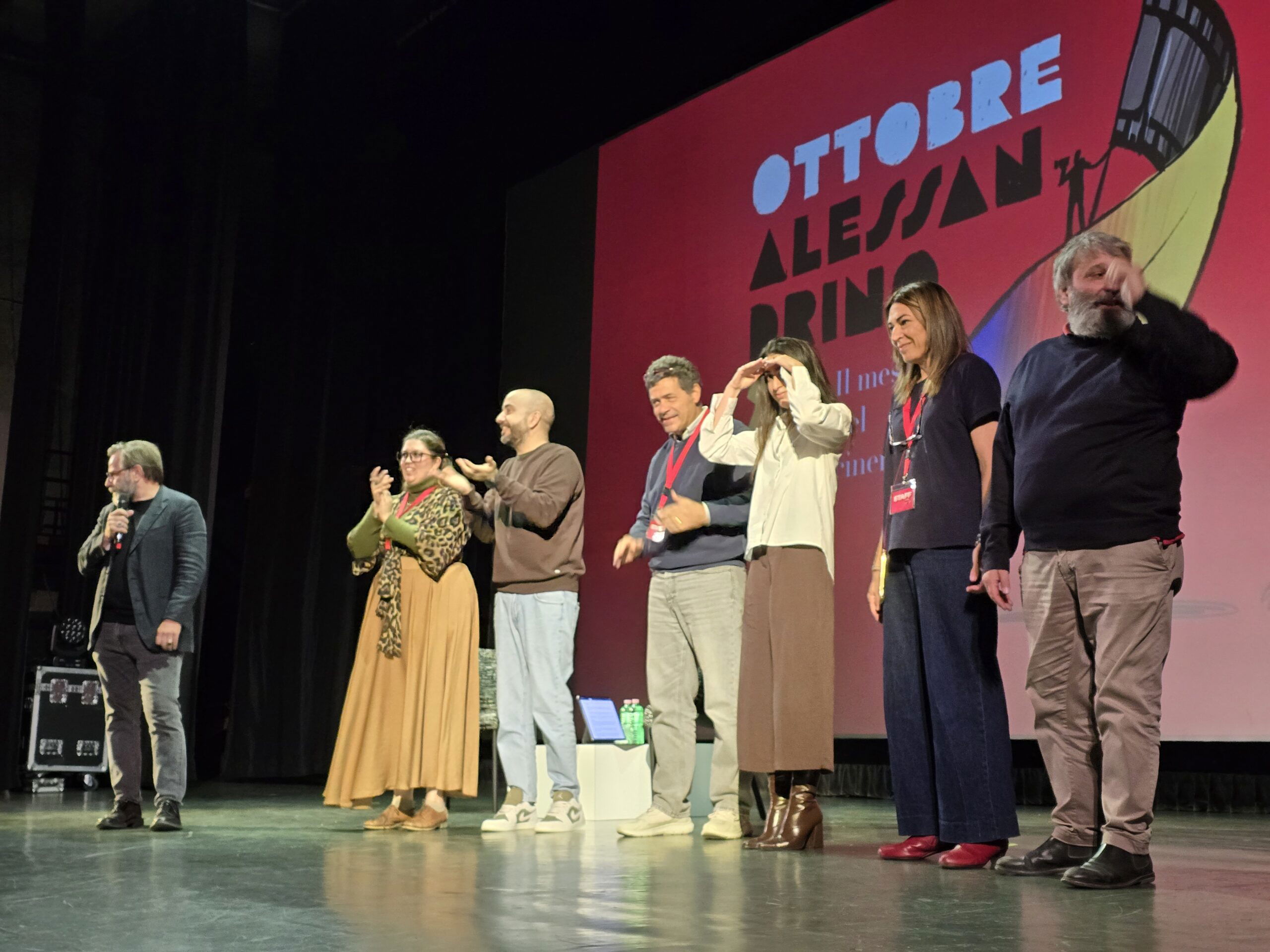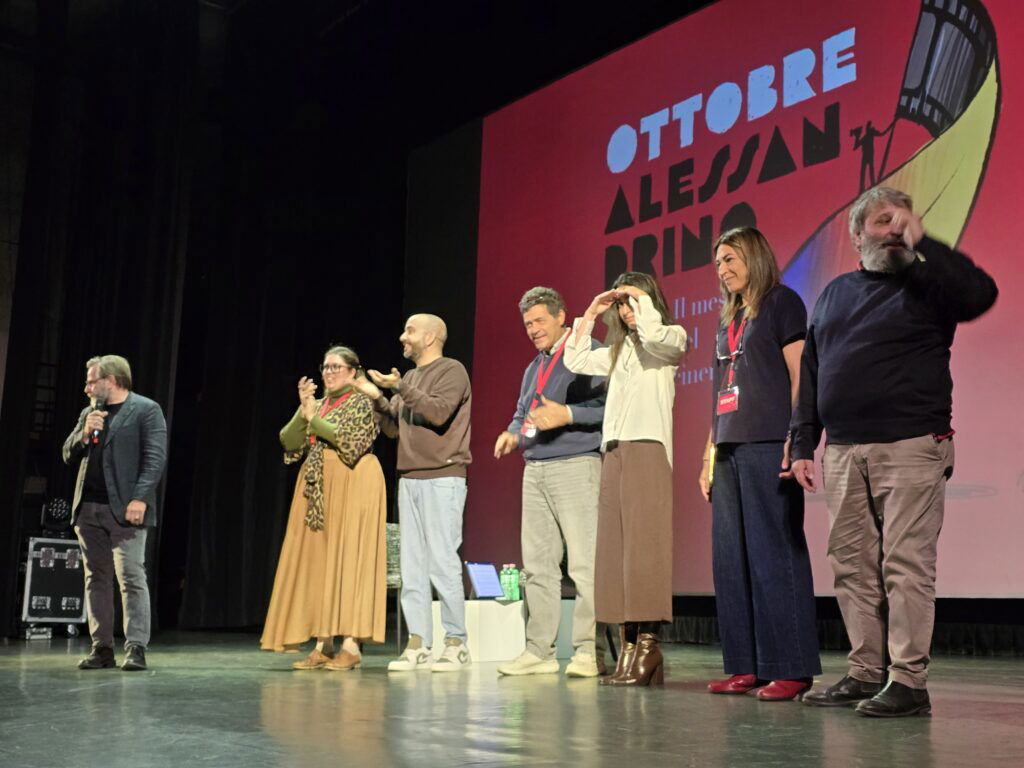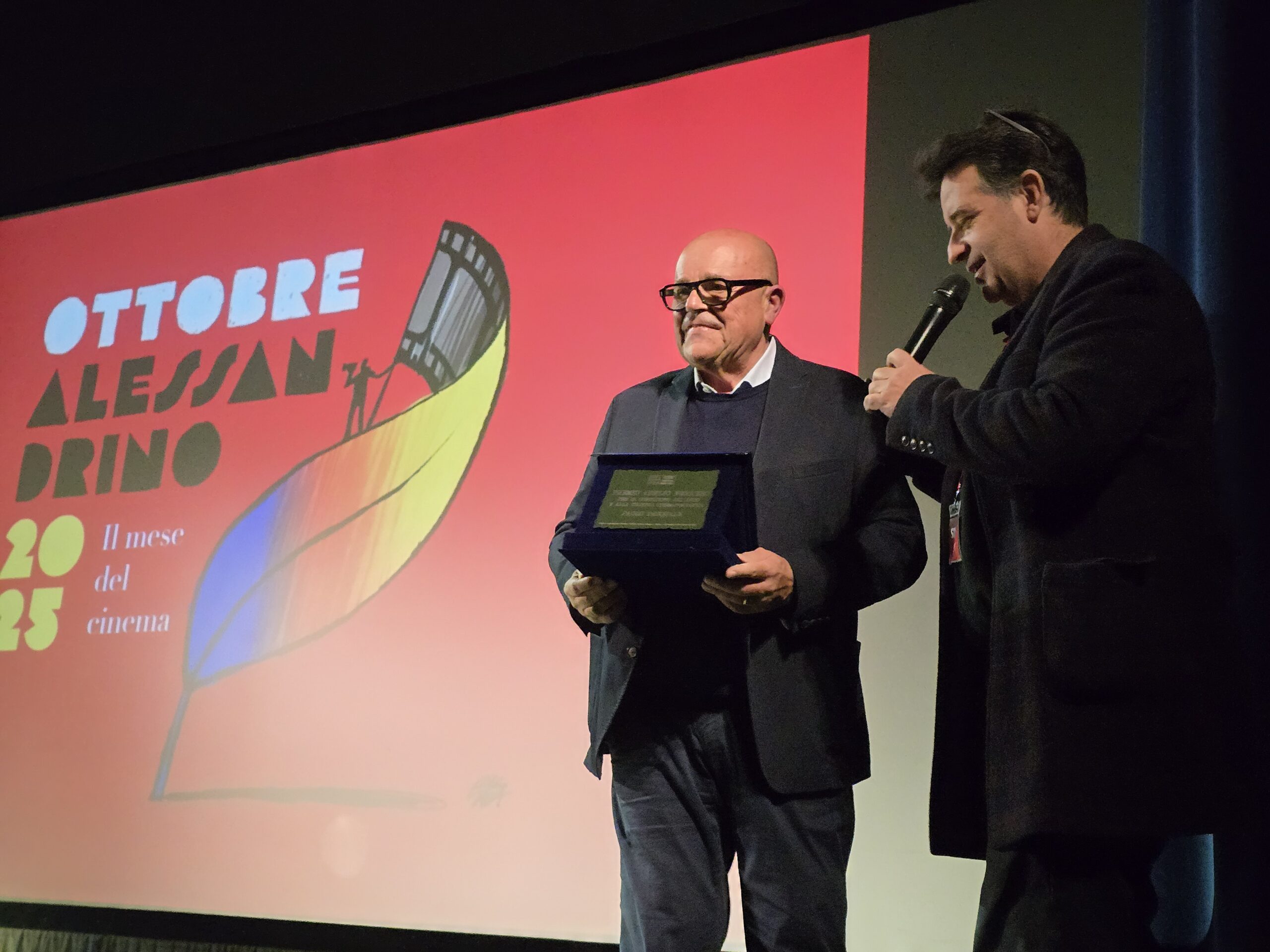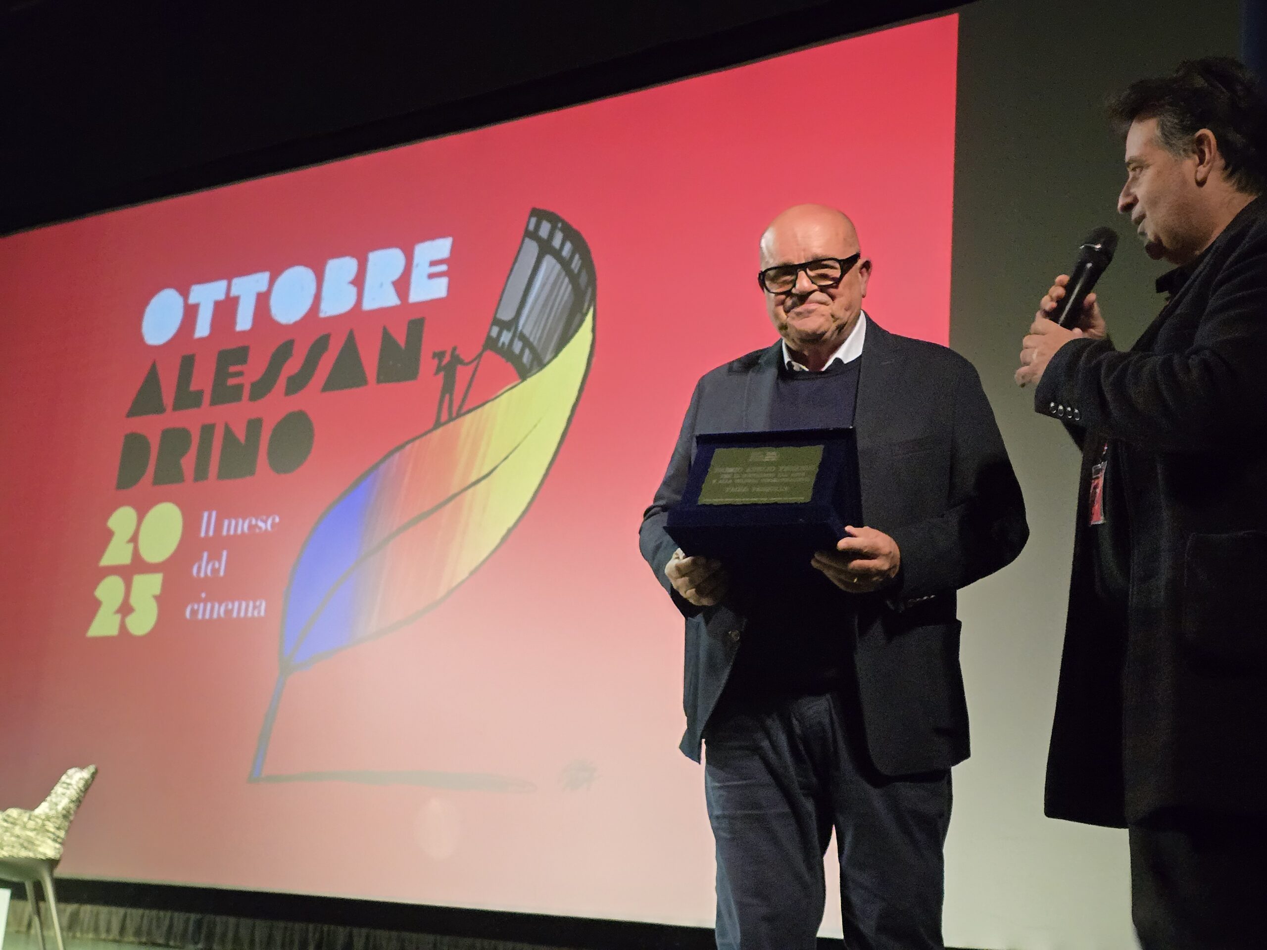 ALESSANDRIA – Durante l’intenso pomeriggio di oggi, domenica, 5 ottobre 2025, per l’Ottobre Alessandrino, a cominciare dalla toccante intervista ad Anna Foglietta, c’è stato spazio per tributare un meritato premio a Paolo Pasquale per l’impegno culturale e artistico dimostrato negli anni. Pasquale da decenni gestisce le sale cinematografiche di Alessandria e ha permesso alla città di poter beneficiare di spettacoli teatrali pur orfana del Comunale. A premiarlo oggi Luca Ribuoli, direttore artistico dell’Ottobre Alessandrino insieme a Roberto Lasagna, critico cinematografico e co-organizzatore dell’evento. Sul palco poi tributo anche a tutti coloro che hanno permesso di realizzare il festival del cinema in città, che andrà avanti fino a fine ottobre.