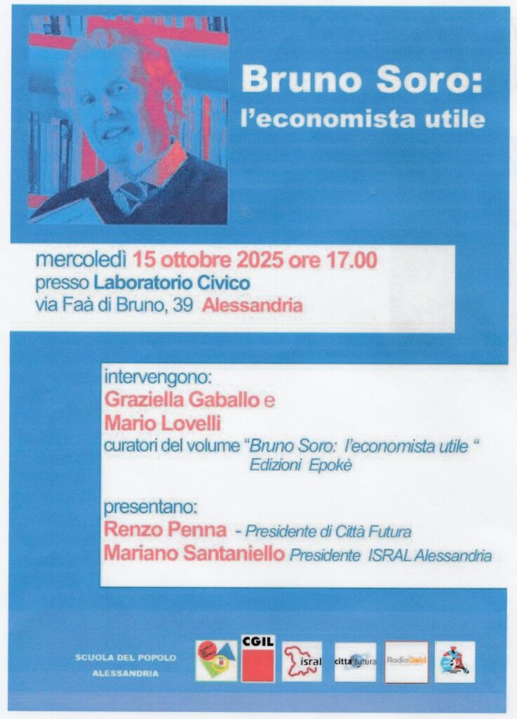 ALESSANDRIA – L’associazione Città Futura e la Scuola del Popolo della Cgil ricordano l’amico e l’economista Bruno Soro. Mercoledì 15 ottobre, alle 17, al Laboratorio Civico di Via Faà di Bruno, 39, Alessandria.