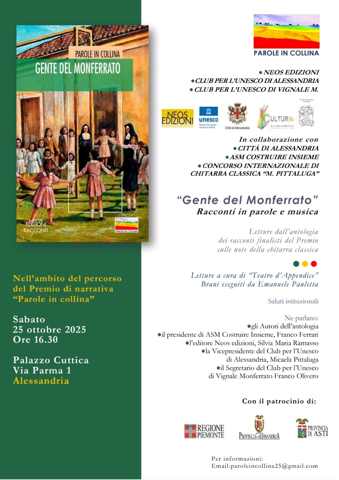 L’evento, patrocinato da Regione Piemonte, Provincia di Alessandria e Provincia di Asti, si terrà sabato 25 ottobre alle ore 16.30 presso Palazzo Cuttica, in via Parma 1, Alessandria. Per informazioni: paroleincollina25@gmail.com
