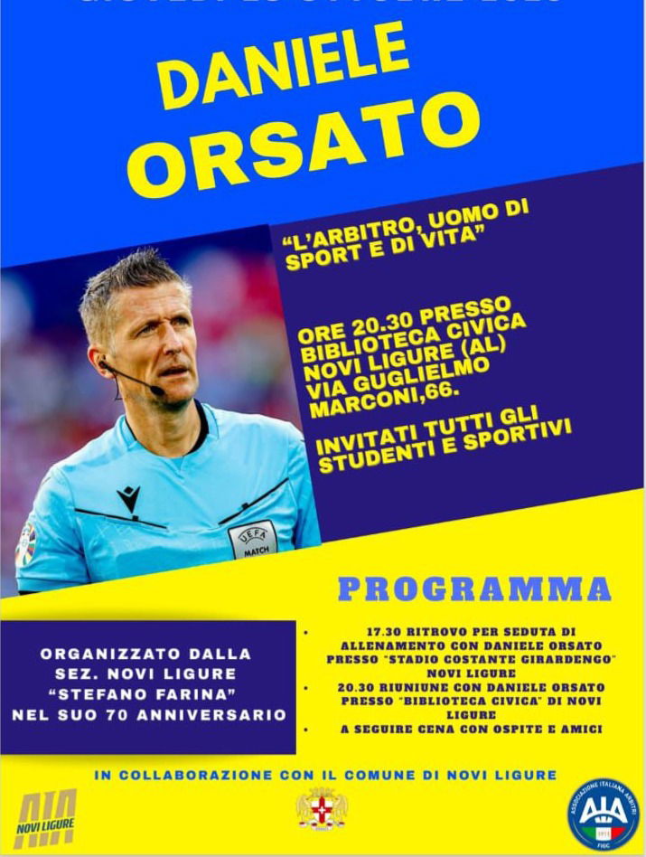 NOVI LIGURE – Questo giovedì, 23 ottobre 2025, alle 20.30, alla biblioteca civica di Novi in via Guglilmo Marconi 66, nell’ambito della ricorrenza del 70° anno di fondazione della sezione novese intitolata a Stefano Farina, sarà presente l’ex arbitro di calcio Daniele Orsato della sezione di Schio , attualmente commissario per lo sviluppo del talento arbitrale dell’AIA