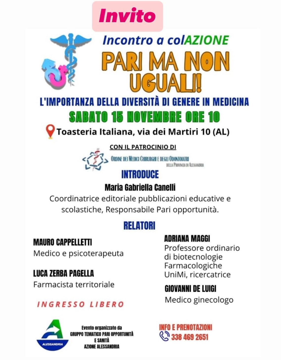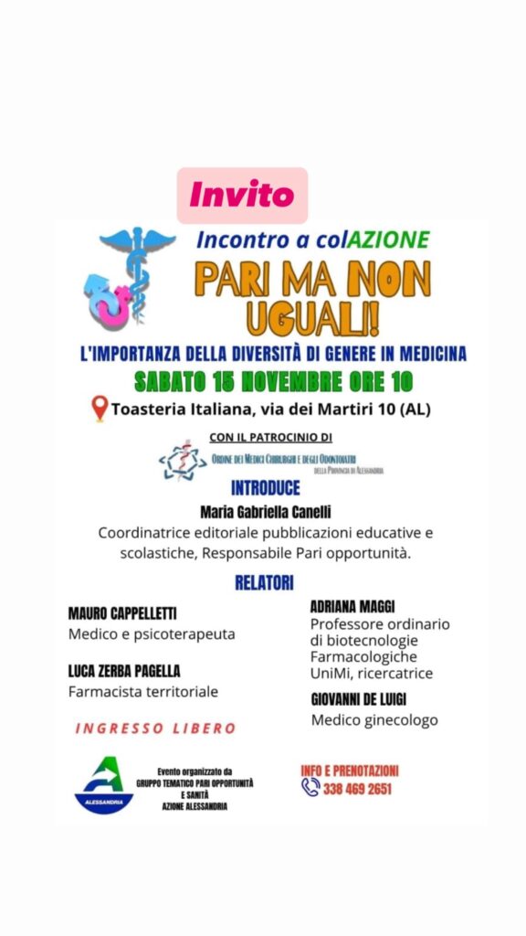 ALESSANDRIA – Sabato 15 novembre 2025 ad Alessandria appuntamento con Azione sull’importanza della diversità di genere in medicina. Si terrà alla Toasteria italiana in via dei Martiri 10 ad Alessandria, dalle 10, con il patrocinio dell’ordine dei medici chirurghi e degli odontoiatri della provincia di Alessandria. Introdurrà Maria Gabriella Canelli, coordinatrice editoriale pubblicazioni educative e scolastiche oltre che responsabile Pari opportunità. I relatori saranno Mauro Cappelletti, medico e psicoterapeuta, Adriana Maggi, Professoressa ordinaria di biotecnologie farmacologiche UniMi e ricercatrice, Luca Zerba Pagella, Farmacista territoriale, e Giovanni De Luigi, Medico ginecologo. L’ingresso è libero.