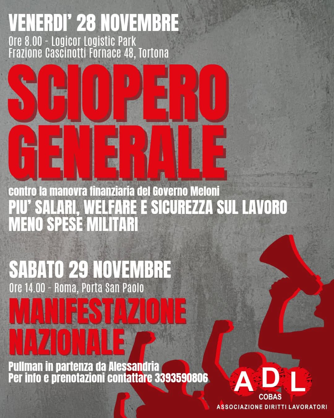 TORTONA – Altri scioperi all’orizzonte nei prossimi giorni in provincia di Alessandria. Venerdì 28 novembre 2025, ADL Cobas ha proclamato insieme a tutto il sindacalismo di base lo sciopero generale in tutta Italia. Una giornata di lotta necessaria e urgente, costruita dal basso insieme a lavoratrici e lavoratori per denunciare un modello economico e politico che penalizza chi lavora, chi studia e chi vive di salario e non di rendita.