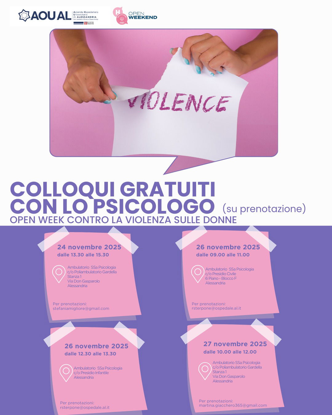 Il primo appuntamento è previsto lunedì 24 novembre al Poliambulatorio Gardella, dalle 13.30 alle 15.30, con accesso su prenotazione scrivendo a stefaniamigliore@gmail.com. L’iniziativa prosegue mercoledì 26 novembre al Presidio Civile Santi Antonio e Biagio al mattino, al sesto piano del Blocco F, dalle 9.00 alle 11.00; mentre dalle 12.30 alle 13.30 saranno disponibili colloqui presso l’Ambulatorio della SSA Psicologia del Presidio Infantile: è necessario prenotarsi scrivendo a rsterpone@ospedale.al.it. L’ultima giornata è fissata per giovedì 27 novembre nuovamente al Poliambulatorio Gardella, dalle 10.00 alle 12.00. Per prenotarsi a questa giornata è necessario scrivere una mail a martina.giacchero365@gmail.com.