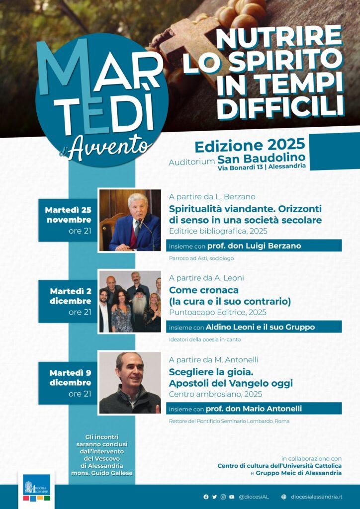 ALESSANDRIA – Da più di quarant’anni sono una presenza stabile nell’autunno culturale e spirituale di Alessandria. I Martedì di Avvento, promossi dalla Diocesi in collaborazione con il Centro di cultura dell’Università Cattolica e il Meic (Movimento ecclesiale di impegno culturale), ritornano anche quest’anno con un tema che sembra cucito sul presente: “Nutrire lo spirito in tempi difficili”. Un ciclo ormai entrato nella tradizione cittadina, capace di attraversare generazioni e cambiamenti sociali senza perdere la propria identità: quella di uno spazio di ascolto, riflessione e confronto a partire dai libri e dalle voci dei loro autori.