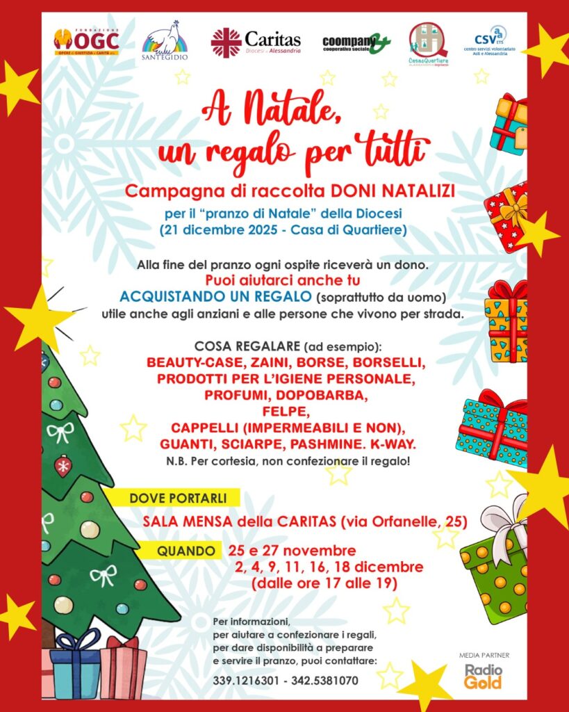 ALESSANDRIA – Anche in provincia il fenomeno della povertà sta diventando sempre più feroce. L’ultimo rapporto Caritas ha mostrato la gravità della situazione e la necessità di trovare soluzioni o almeno di rendersi conto della portata del problema. Parallelamente però sono molte le realtà che cercano sempre di aiutare chi è in difficoltà durante tutto l’arco dell’anno e naturalmente anche a Natale. Così torna “A Natale un regalo per tutti” il modo delicato e gentile per dare un po’ di calore a persone che non hanno più una famiglia e finiscono per diventare invisibili nel quotidiano. Proprio per restituire sorrisi e dignità a chi non ha una casa né affetti verrà riproposto il pranzo di Natale, in programma il 21 dicembre, con un menu da grande festa ma saranno consegnati a mano e personalmente piccoli doni frutto della generosità dei cittadini. Tutti infatti potranno partecipare portando ogni settimana regali, nuovi, che verranno poi impacchettati. Si potranno consegnare zaini, borse, borselli, prodotti per l’igiene personali, profumi, guanti, sciarpe, k-way, cappelli. La raccolta avverrà il 25 e 27 novembre e poi il 2, 4, 9, 11, 16, 18 dicembre, dalle 17 alle 19. I doni, non impacchettati, potranno essere portati nella sala mensa della Caritas in via delle Orfanelle 25 ad Alessandria.