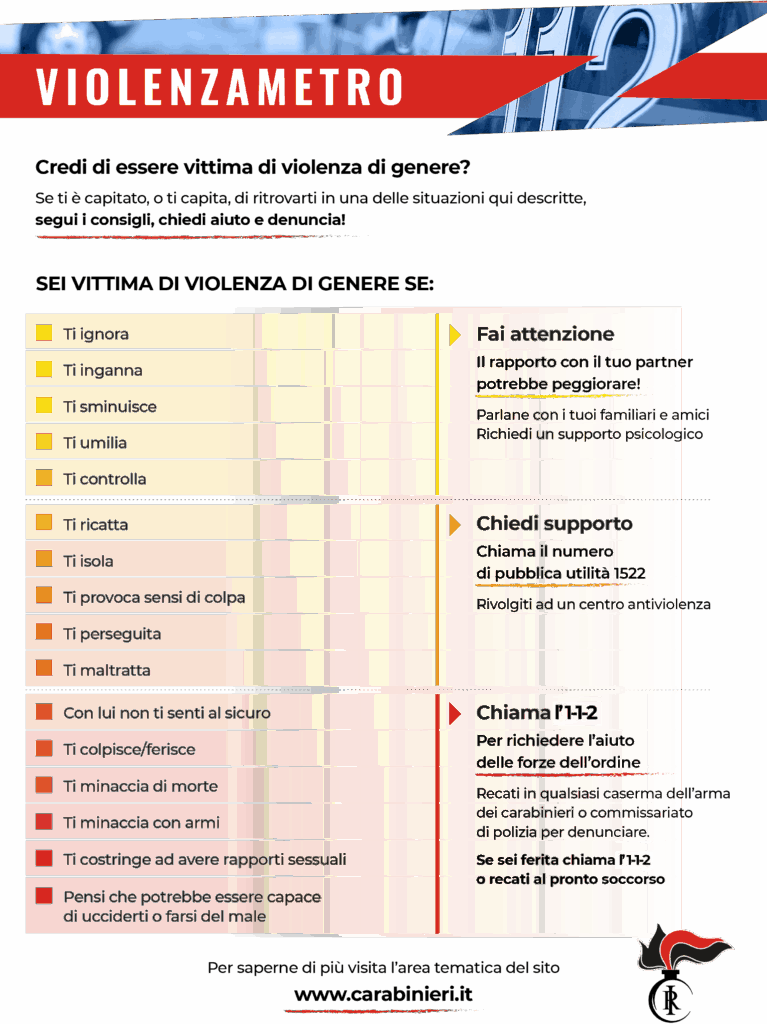Inoltre, sul sito www.carabinieri.it, è stata dedicata un’intera sezione al “Codice Rosso”, che offre informazioni sul fenomeno e sugli strumenti di tutela delle vittime, mettendo a disposizione un test di autovalutazione, denominato “Violenzametro”, che rileva il livello di violenza subita in un rapporto di coppia.