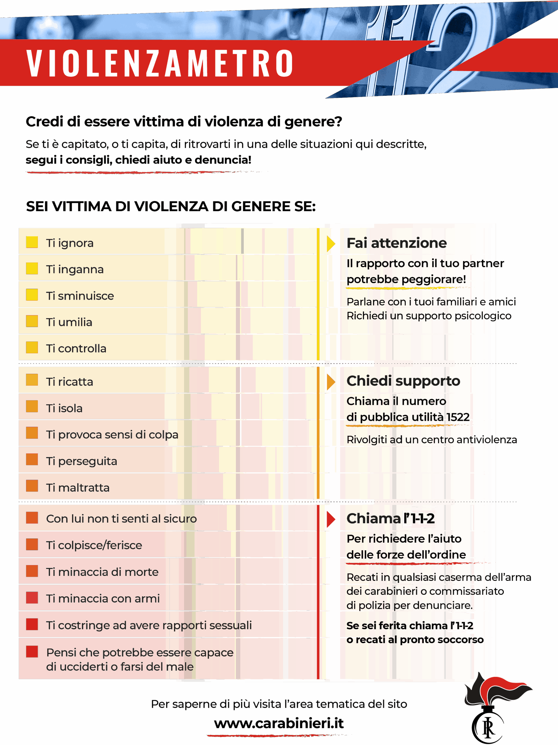 Inoltre, sul sito www.carabinieri.it, è stata dedicata un’intera sezione al “Codice Rosso”, che offre informazioni sul fenomeno e sugli strumenti di tutela delle vittime, mettendo a disposizione un test di autovalutazione, denominato “Violenzametro”, che rileva il livello di violenza subita in un rapporto di coppia.
