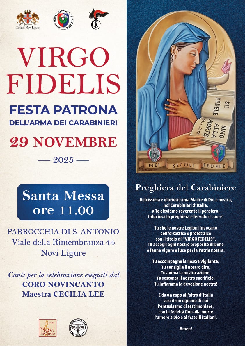 NOVI LIGURE – Anche quest’anno i Carabinieri della Compagnia di Novi Ligure rinnoveranno una delle ricorrenze più sentite per l’Arma: la Festa della Virgo Fidelis, Patrona dei Carabinieri. La celebrazione religiosa si svolgerà nei prossimi giorni, a breve distanza dalla cerimonia ufficiale del 21 novembre, e rappresenta un momento di raccoglimento e condivisione per militari, famiglie e comunità locale.