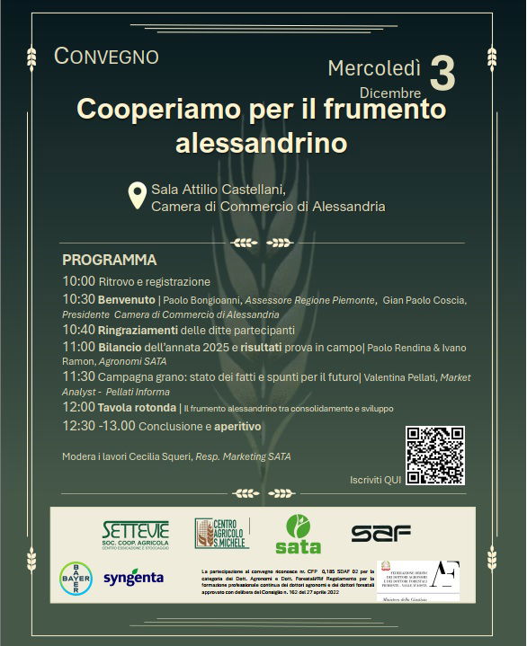 ALESSANDRIA – Un appuntamento per fare il punto su un anno di lavoro condiviso e, allo stesso tempo, per rilanciare le sfide future della cerealicoltura locale. Martedì 3 dicembre 2025, alle 10, la Camera di Commercio di Alessandria ospiterà il secondo convegno annuale del progetto “Cooperiamo per il frumento alessandrino”, promosso da SATA S.r.l., Settevie Soc. Coop. Agricola e Centro Agricolo San Michele.