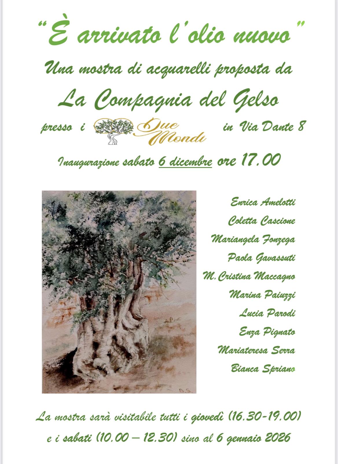 ALESSANDRIA – Sabato 6 dicembre 2025, dalle 17, nei locali dei Due Mondi, in via Dante 8 ad Alessandria, si terrà la mostra di acquarelli proposta dalla Compagnia del Gelso, “È arrivato l’olio nuovo“. La rassegna propone delicate e suggestive opere di Enrica Amelotti, Coletta Cascione, Mariangela Fonzega, Paola Gavassuti, Maria Cristina Maccagno, Marina Paiuzzi, Lucia Parodi, Enza Pignato, Mariateresa Serra, Bianca Spriano. I proventi deli acquarelli che i visitatori vorranno eventualmente acquistare, andranno in favore dell’Associazione Fulvio Minetti. La mostra sarà visitabile tutti i giovedì dalle 16.30 alle 19 e tutti i sabati dalle 10 alle 12.30, fino al 6 gennaio.