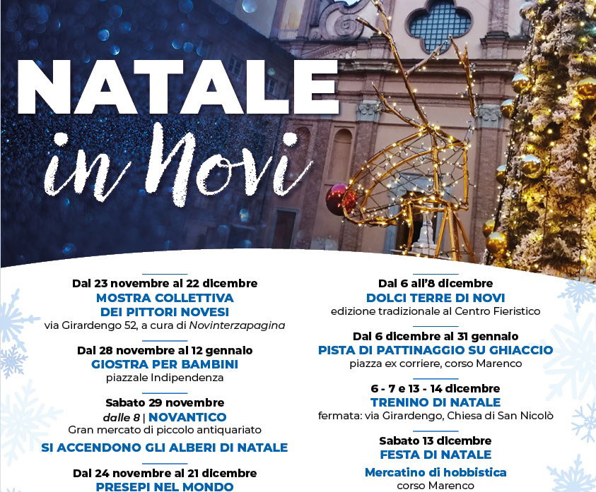 Il clou delle iniziative nel cuore cittadino arriverà con la Festa di Natale di sabato 13 dicembre. Per tutta la giornata corso Marenco ospiterà il mercatino di hobbistica; dalle 15 piazza Carenzi sarà colorata dalla sfilata dei “Babbi Natale a modo mio”, a cura della Pro Loco Parco Castello. Gran finale alle 16 in piazza Dellepiane con il concerto della Shary Band, tributo nazionale alla disco dance già apprezzato dal pubblico novese: uno show travolgente che unisce musical e live concert, pensato per far cantare e ballare la piazza.