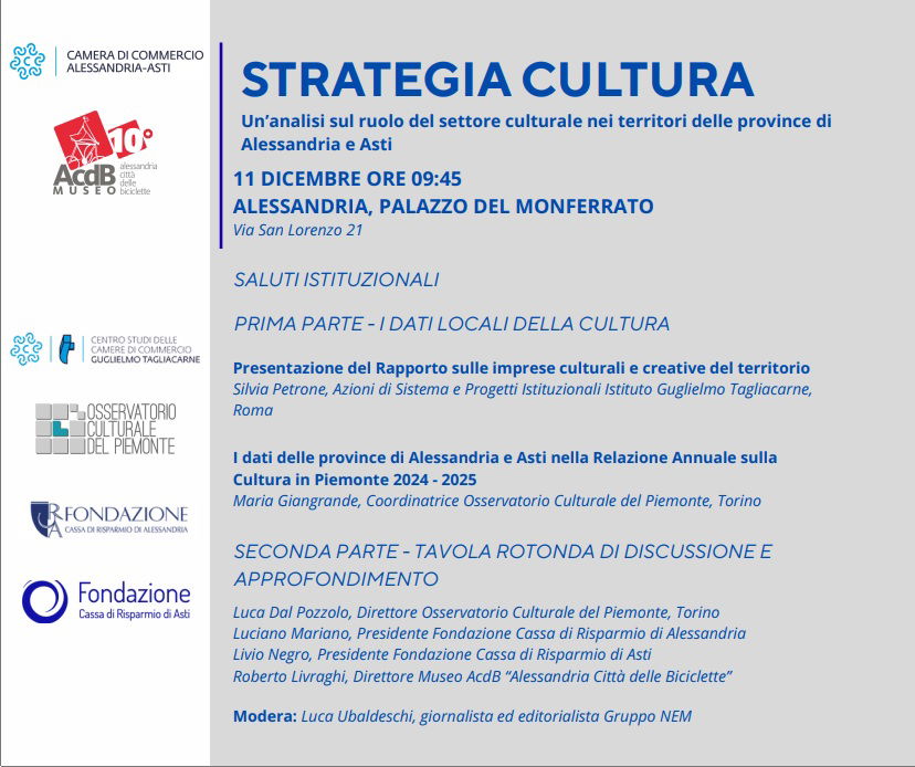 Il convegno si inserisce inoltre in una ricorrenza significativa: il decennale del museo “ACDB – Alessandria Città delle Biciclette”, struttura gestita dalla Camera di Commercio nei locali di Palazzo del Monferrato. Un legame che rafforza il senso dell’evento come momento di bilancio e rilancio della cultura come leva di crescita.
