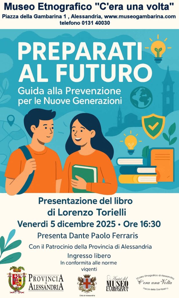 ALESSANDRIA – Questo pomeriggio, alle 16.30, al Museo etnografico “C’era una volta” in piazza della Gambarina 1 ad Alessandria, verrà presentato il libro di Lorenzo Torielli, “Preparati al futuro”, una guida alle prevenzione per le nuove generazioni.