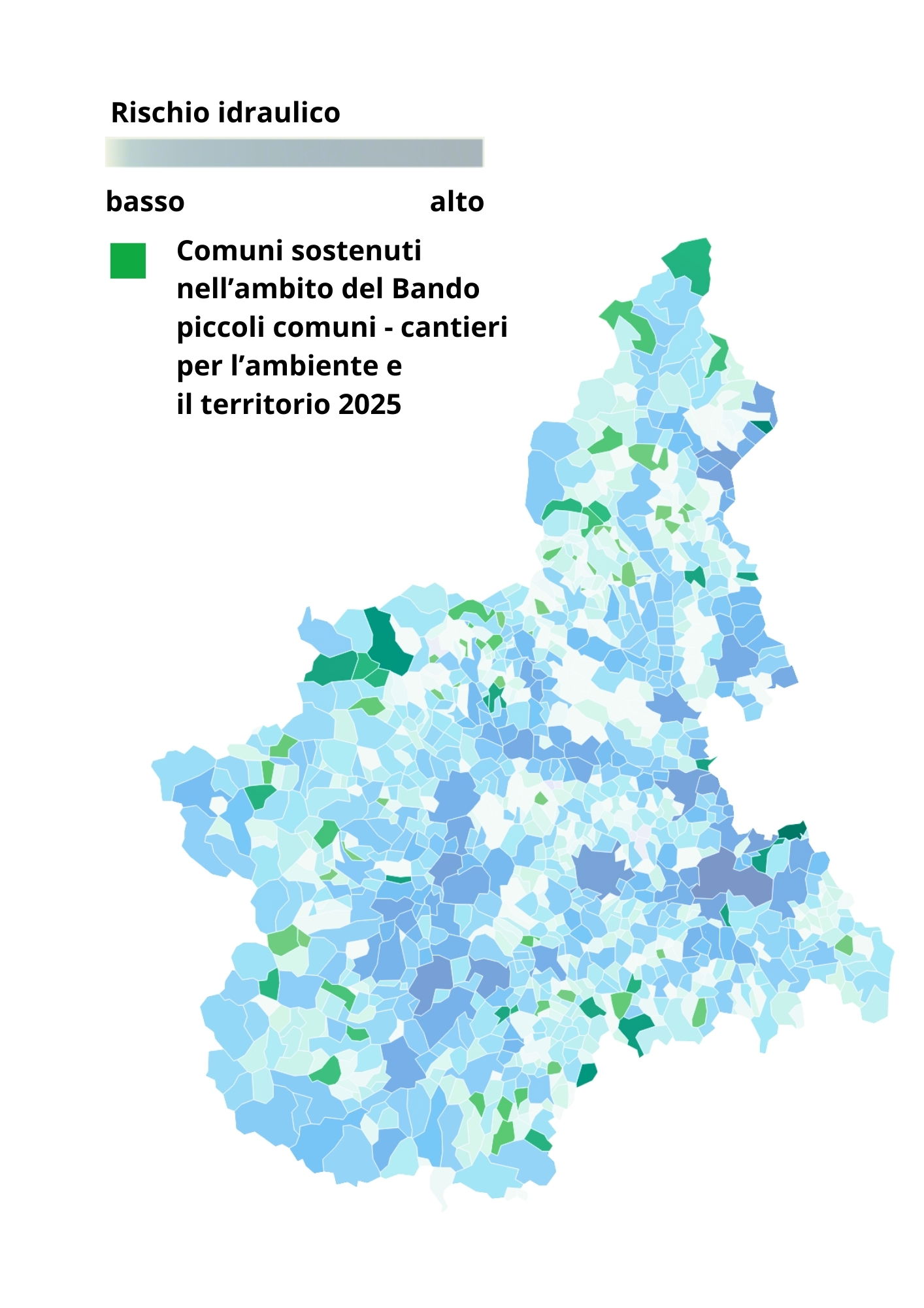 La maggior parte dei Comuni finanziati si trova in aree a elevato rischio idrogeologico, confermando la pertinenza del bando nel sostenere le comunità più esposte. Un quadro che trova riscontro nei dati ISPRA: le aree alpine e prealpine delle province di Torino, Cuneo, Verbano-Cusio-Ossola e Biella registrano i livelli più alti di pericolosità da frana, soprattutto nelle zone montane e collinari, mentre il rischio idraulico risulta più marcato lungo i principali assi fluviali – Po, Tanaro, Dora Baltea, Sesia – e nelle aree di fondovalle e pianura, in particolare nelle province di Alessandria, Vercelli e Novara.