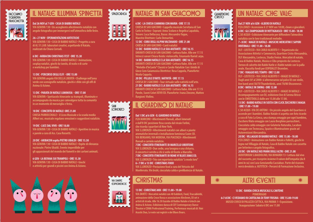 ALESSANDRIA – Ad Alessandria fine settimana ricchissimo di appuntamenti natalizi, tra centro storico, Borgo Rovereto e Spinetta Marengo. Sabato 20 e domenica 21 dicembre il calendario propone laboratori per famiglie, animazioni a tema, spettacoli itineranti, concerti e momenti dedicati alla solidarietà: un weekend perfetto per vivere la città a passo lento, tra luci, cultura e comunità.