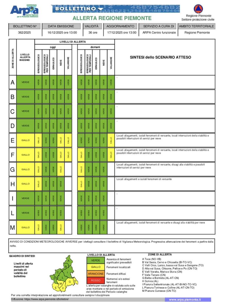 PIEMONTE – Ancora allerta gialla per rischio idrogeologico nelle prossime ore nel basso Piemonte nelle prossime ore. Nella seconda parte del pomeriggio di oggi, martedì 16 dicembre, sono previsti precipitazioni più intense sulle aree sudorientali al confine con la Liguria fino a fine giornata, spiega Arpa.