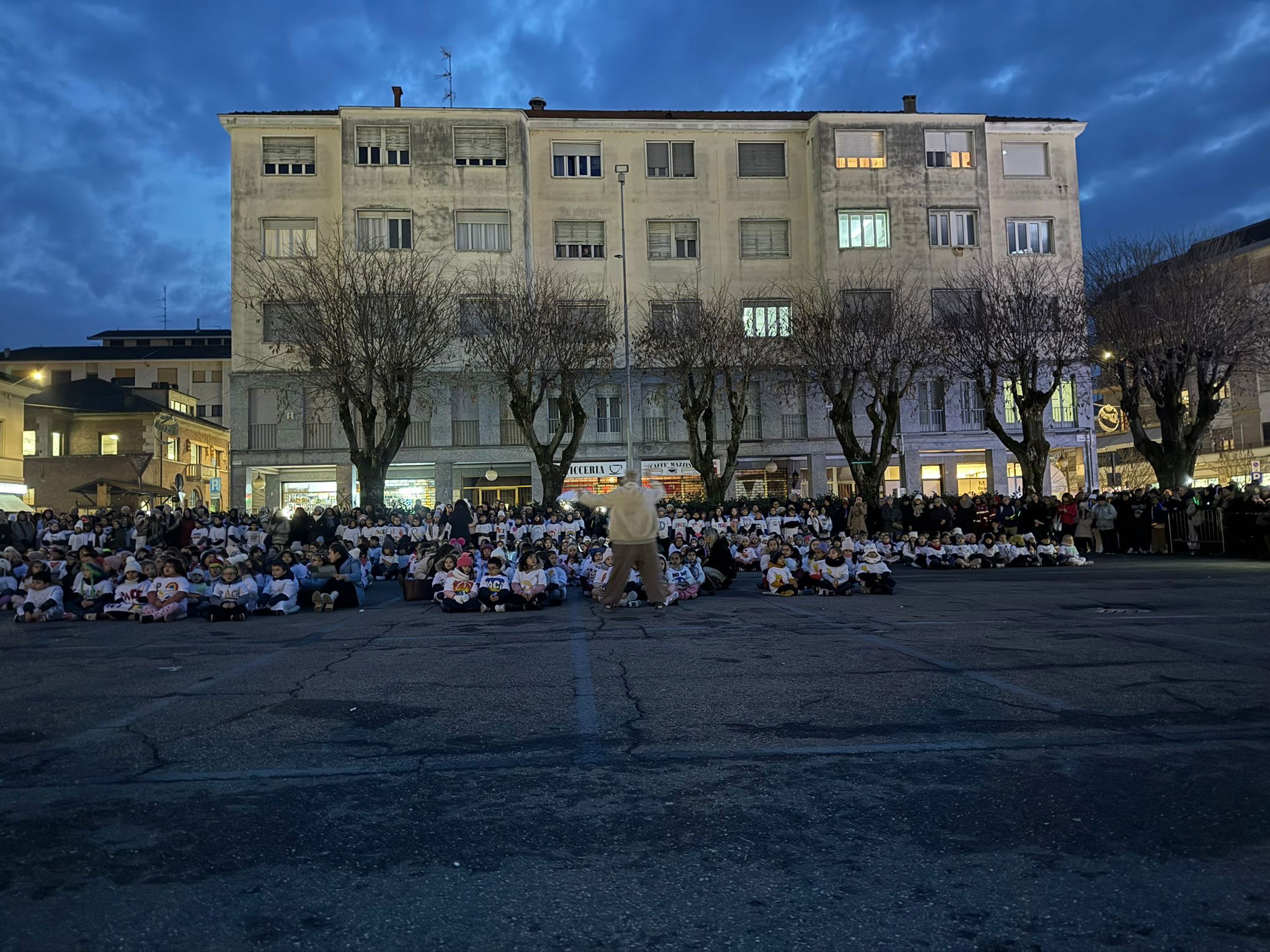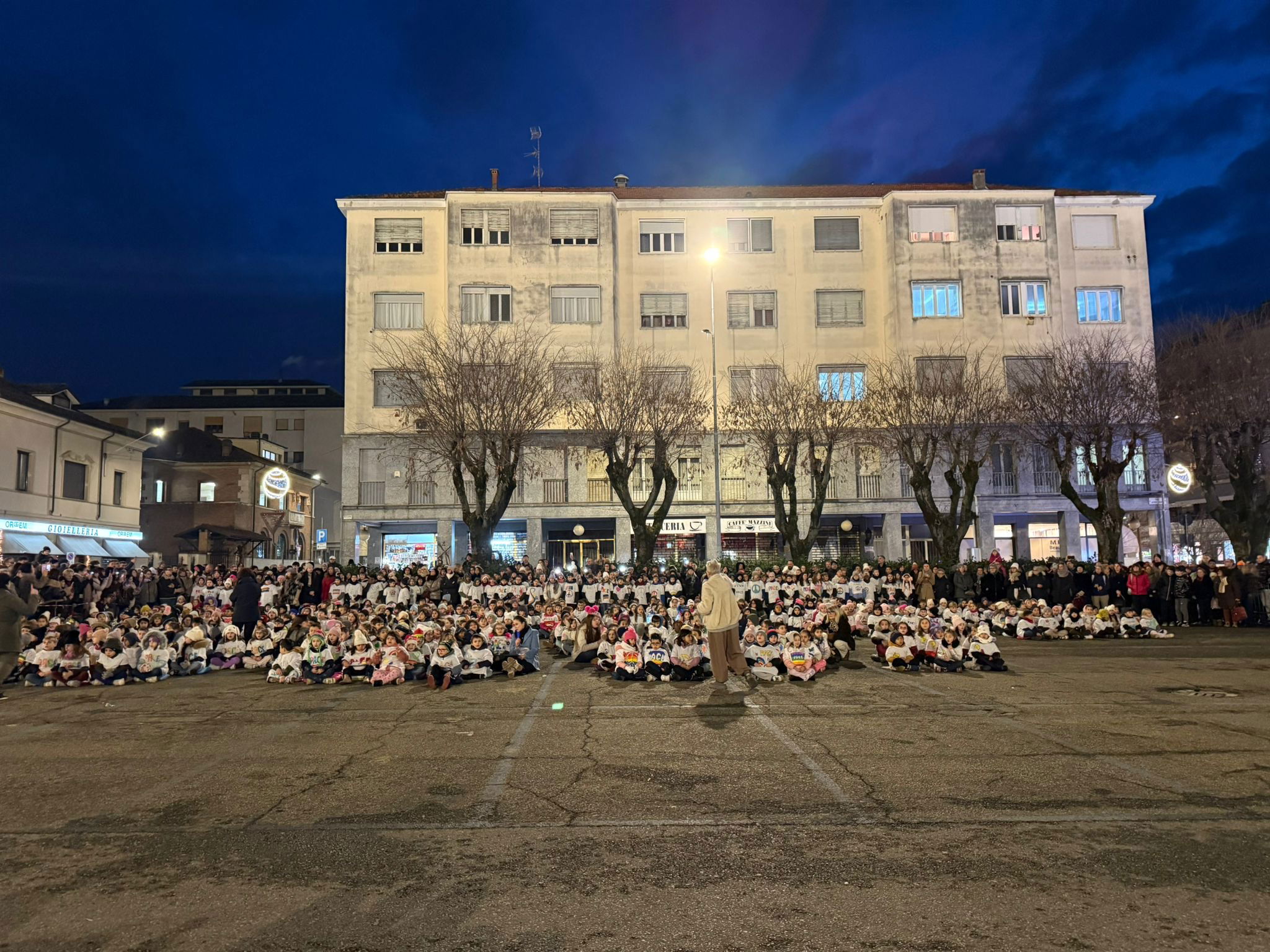 VALENZA – Un grande coro di piccole voci ha riempito piazza Gramsci a Valenza. Lunedì pomeriggio circa 650 bambini degli istituti Don Minzoni e Sette Fratelli Cervi si sono radunati nel cuore della città dell’oro per cantare insieme “Un canto per la pace”, regalando a Valenza un momento dal forte valore simbolico.