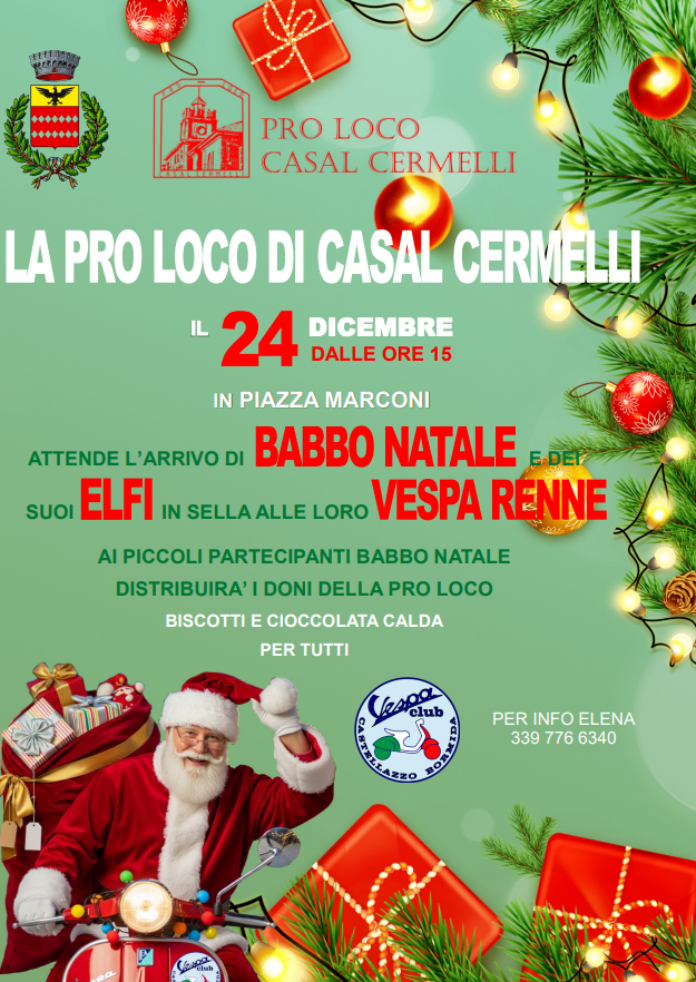 CASAL CERMELLI – Sarà un Babbo Natale un po’ vintage ma sicuramente veloce quello che oggi pomeriggio, 24 dicembre, alle 16, arriverà a Casal Cermelli. La Pro Loco del paese infatti ha organizzato, in piazza Marconi, il divertente appuntamento con Santa Claus, insieme ai suoi elfi in sella alle loro “Vespa renne”.