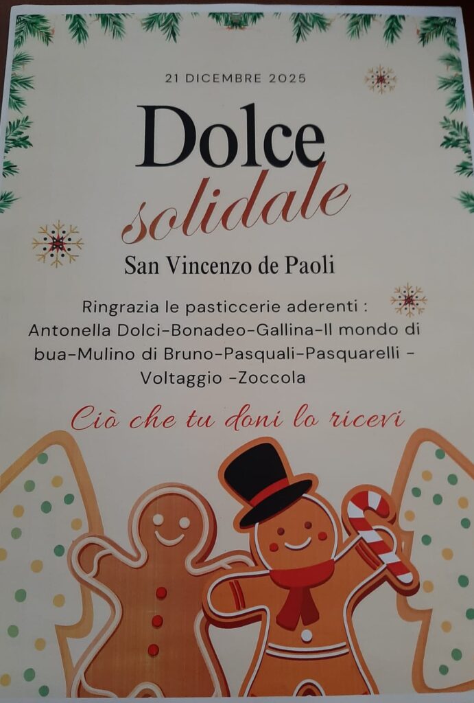 ALESSANDRIA –  Domenica 21 dicembre, dalle 8.30 alle 12.30, al Centro Don Bosco di Alessandria, l’Associazione San Vincenzo de Paoli che opera nella Parrocchia San Giuseppe Artigiano e si dedica alle famiglie bisognose del quartiere Cristo allestirà una bancarella con gustosi dolci artigianali gratuitamente offerti da alcune pasticcerie alessandrine. Con il ricavato raccolto verrà acquistato cibo di prima necessità da distribuire alle 100 famiglie assistite regolarmente dai volontari.