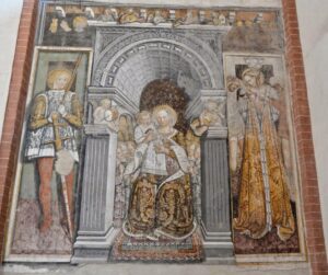 L’altro affresco presente nella chiesa è una Madonna col Bambino realizzata nel 1464, con un effetto particolare e molto bello. La Vergine in trono tiene in braccio Gesù che stringe un cardellino, circondata da angeli musicanti sotto una struttura dalla volta a botte che crea una suggestiva illusione ottica. Il piccolo uccello richiama un’antica leggenda cristiana legata alla Passione di Cristo.