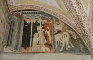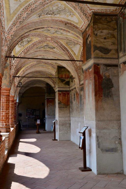 Il portale è una copia novecentesca identica all’originale, ora a Palazzo Madama a Torino. Fate attenzione alle formelle che lo decorano: appaiono identiche, ma in realtà sono completamente diverse una dall’altra. Se invece di entrare da questo portale ci dirigiamo verso il chiostro, ci ritroviamo in un ambiente di grande bellezza ed eleganza, che dona un senso di serenità al visitatore. È formato da un porticato con arcate e volte a crociera che formano i lati di un quadrato; sulle pareti sono visibili i resti di uno straordinario ciclo di affreschi raffigurante la vita di San Benedetto da Norcia, fatti da un ignoto autore. Recenti restauri hanno portato alla luce diverse scene, con un itinerario che parte dalla nascita del santo e arriva alla sua morte; al di sotto di ogni affresco è possibile vedere una didascalia nel volgare del 1400 che spiegava ai visitatori il senso dell’immagine dipinta con la cura e la ricercatezza tipiche delle miniature medievali. Suggestiva è la figura della balia del piccolo Benedetto, raffigurata con gli occhiali, una novità per l’epoca, così come il momento della morte del santo, che avviene in piedi, sorretto dai monaci e alla presenza di un medico.