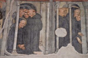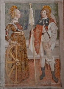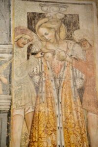 L’immagine è completata dalle figure di San Sebastiano e dal crudo martirio di Sant’Agata, con un forte contrasto tra la raffinatezza degli abiti e la brutalità dei carnefici. L’affresco conta diciotto personaggi, oltre al cardellino, e invita a una lettura lenta e attenta.