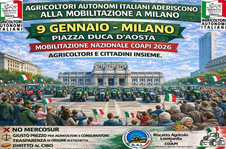 PIEMONTE – Anche gli Agricoltori Autonomi Italiani, aderenti al Coapi, sono tra i promotori della manifestazione di agricoltori che si terrà il 9 gennaio a Milano in Piazza Duca d’Aosta per ribadire il “No senza se e senza ma” all’accordo del Mercosur che “avrà un impatto negativo importante sui redditi agricoli, sulla qualità e sicurezza degli alimenti“.