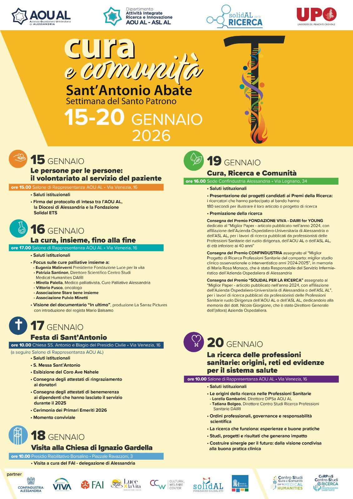 L’edizione 2026 propone momenti di riflessione, condivisione e riconoscimento del lavoro quotidiano svolto all’interno e attorno all’AOU AL. Il calendario di appuntamenti si apre giovedì 15 gennaio alle 15 con l’incontro “Le persone per le persone: il volontariato al servizio del paziente”, in programma nel Salone di Rappresentanza dell’AOU AL. Un’occasione per valorizzare il ruolo del volontariato in ambito sanitario e per la firma del protocollo di intesa tra l’AOU AL, la Diocesi di Alessandria e la Fondazione Solidal ETS.
