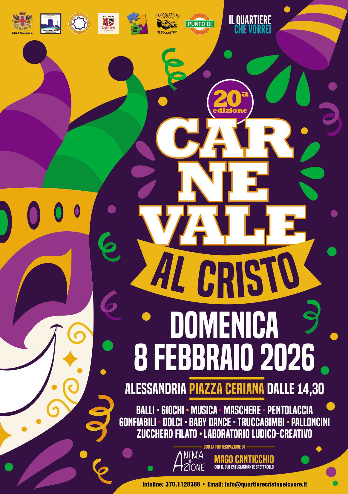 Dalle 14.30 ci saranno gonfiabili, frittelle, dolci, truccabimbi, attrazioni per grandi e piccoli, la pentolaccia, la baby dance in maschera con i ragazzi di Animazione e le magie del Mago Canticchio e tante novità nell’evento promosso da tutte le associazioni del quartiere: Associazione Attività e Commercio Quartiere Cristo, Associazione Alessandria Sud, Pro loco Lisondria 1168, Punto Di, Soms, Centro Incontro Cristo, le Parrocchie e le Scuole del Quartiere. Sarà un grande evento, il primo del 2026 al Quartiere Cristo, con protagoniste anche la Soms e il Centro Incontro Cristo nei giorni precedenti.