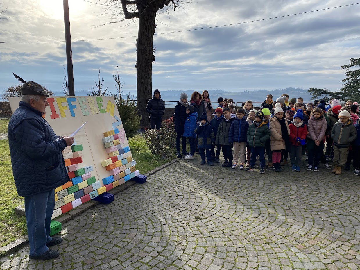 L’atmosfera si è fatta intensa quando le voci degli alunni hanno riempito la piazza. I bambini hanno intonato il brano “Abbasso l’indifferenza”, un inno alla partecipazione e all’empatia che ha profondamente commosso i presenti. Subito dopo, ispirati dalle parole della senatrice a vita Liliana Segre – «Ricordare è un dovere» – gli studenti hanno completato il muro con i loro “mattoni di impegno”: piccoli blocchi colorati, preparati in classe nei giorni precedenti, sui quali ogni bambino aveva scritto una promessa personale, come “Prometto di aiutare chi è solo” o “Prometto di non girarmi dall’altra parte”. Uno dopo l’altro, questi mattoni hanno formato un pannello solido e variopinto, simbolo di una società che non vuole dimenticare. A suggellare il momento, un timido sole invernale ha fatto capolino, quasi a ringraziare l’impegno di bambine e bambini.