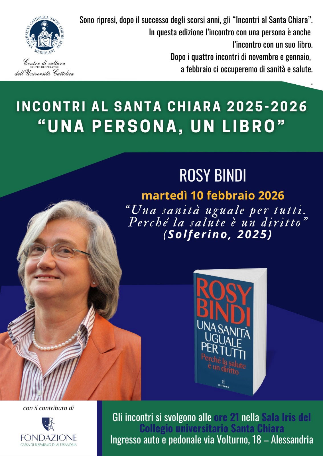 ALESSANDRIA – Sanità e salute al centro del prossimo incontro del ciclo “Una persona, un libro” al Santa Chiara di Alessandria. Martedì 10 febbraio 2026, alle 21, nella sala Iris in via Volturno 18, arriverà Rosy Bindi per presentare il suo ultimo libro, “Una sanità uguale per tutti – Perché la salute è un diritto”. Si tratterà del penultimo appuntamento prima di quello conclusivo, fissato per il 3 marzo con il rettore dell’Università Cattolica, la prof.ssa Elena Beccalli, invitata per parlare del suo libro “Per una nuova economia”.