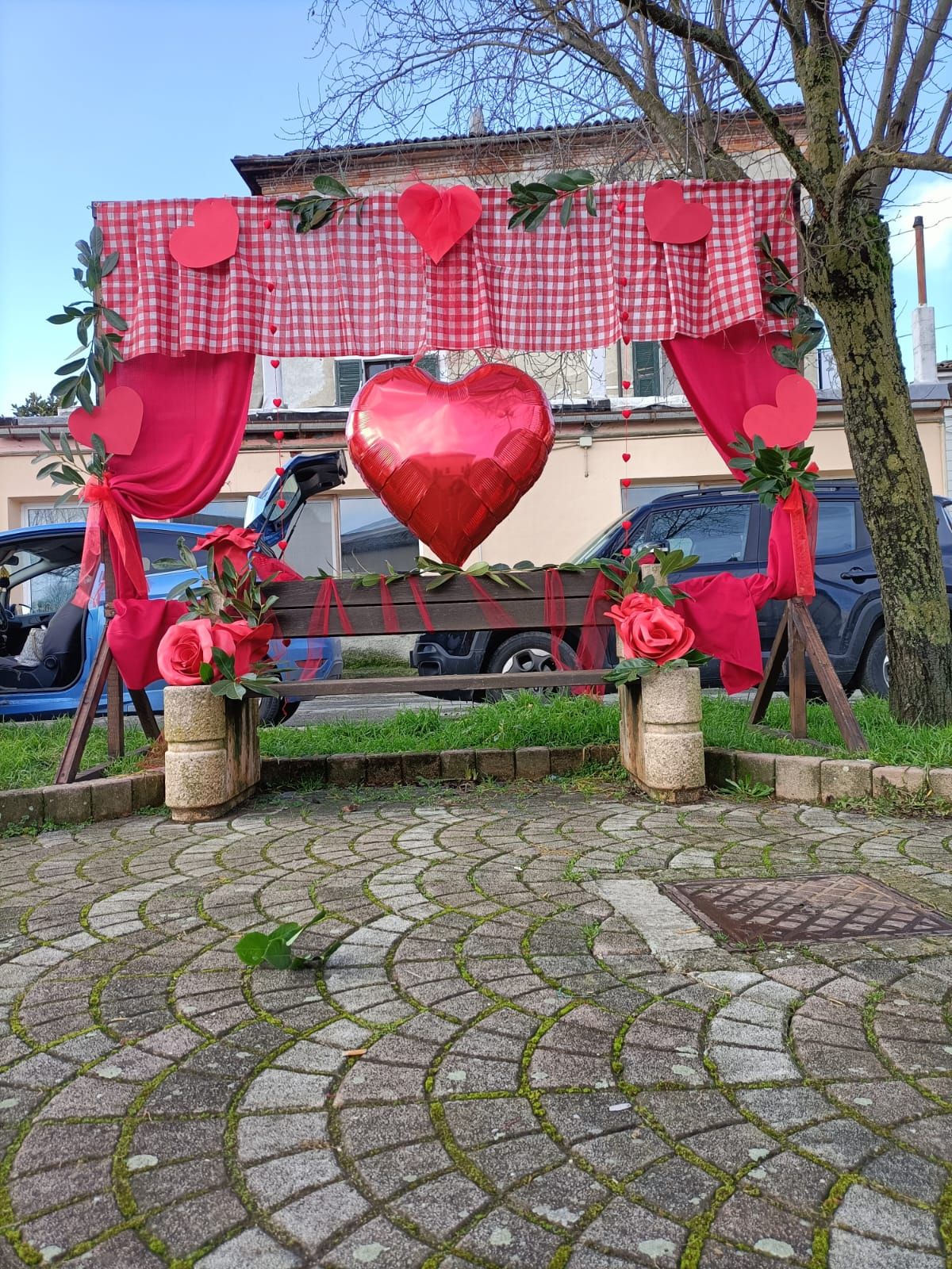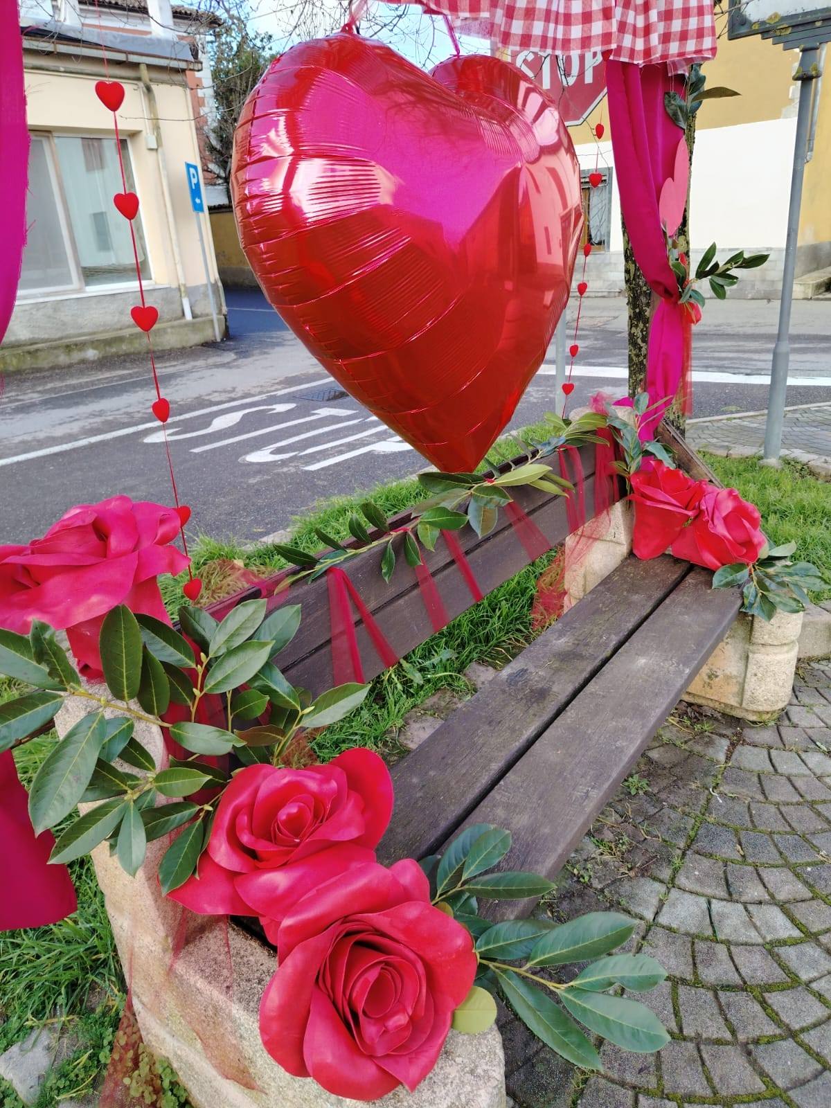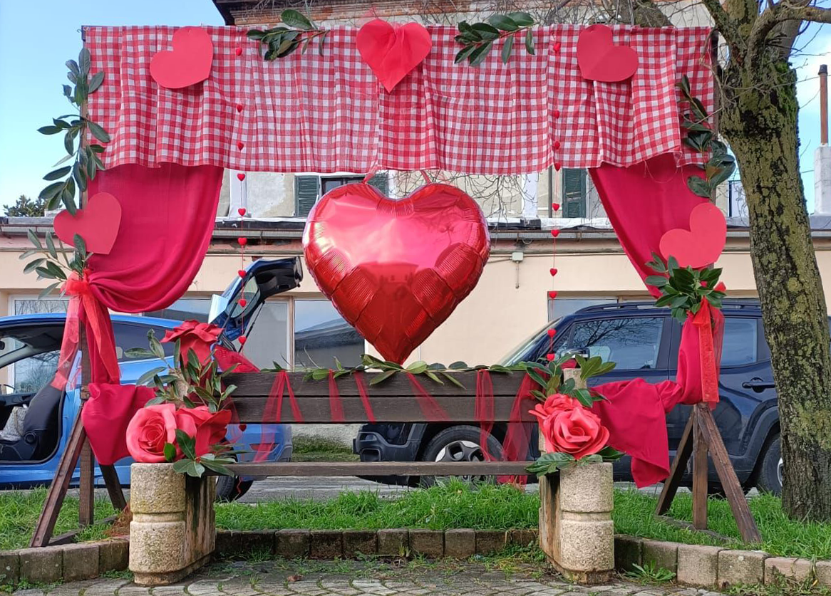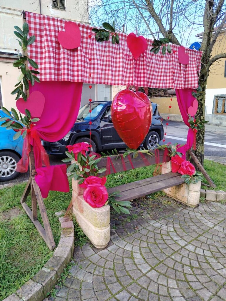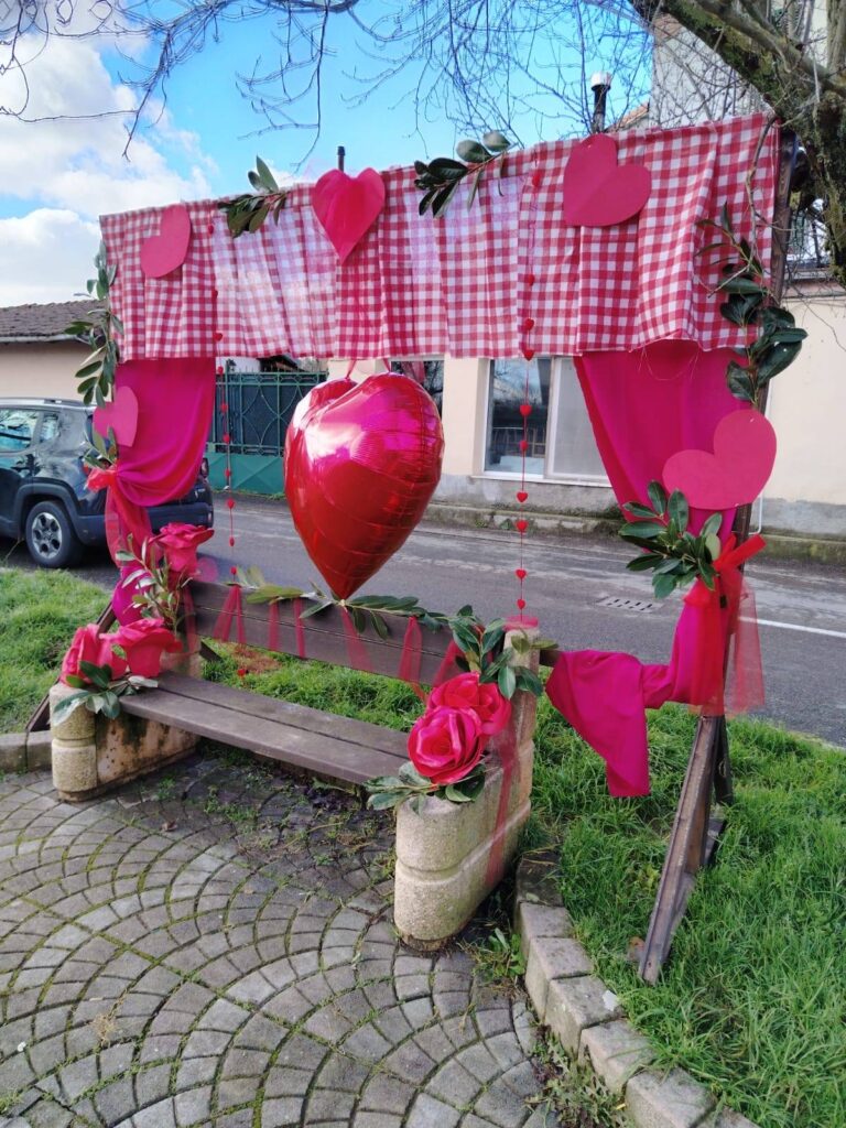 Un enorme cuore e dei nastri rossi abbelliscono la panchina di piazza don Orione. Un’occasione per realizzare uno scatto perfetto da postare sui social e scoprire un piccolo borgo.