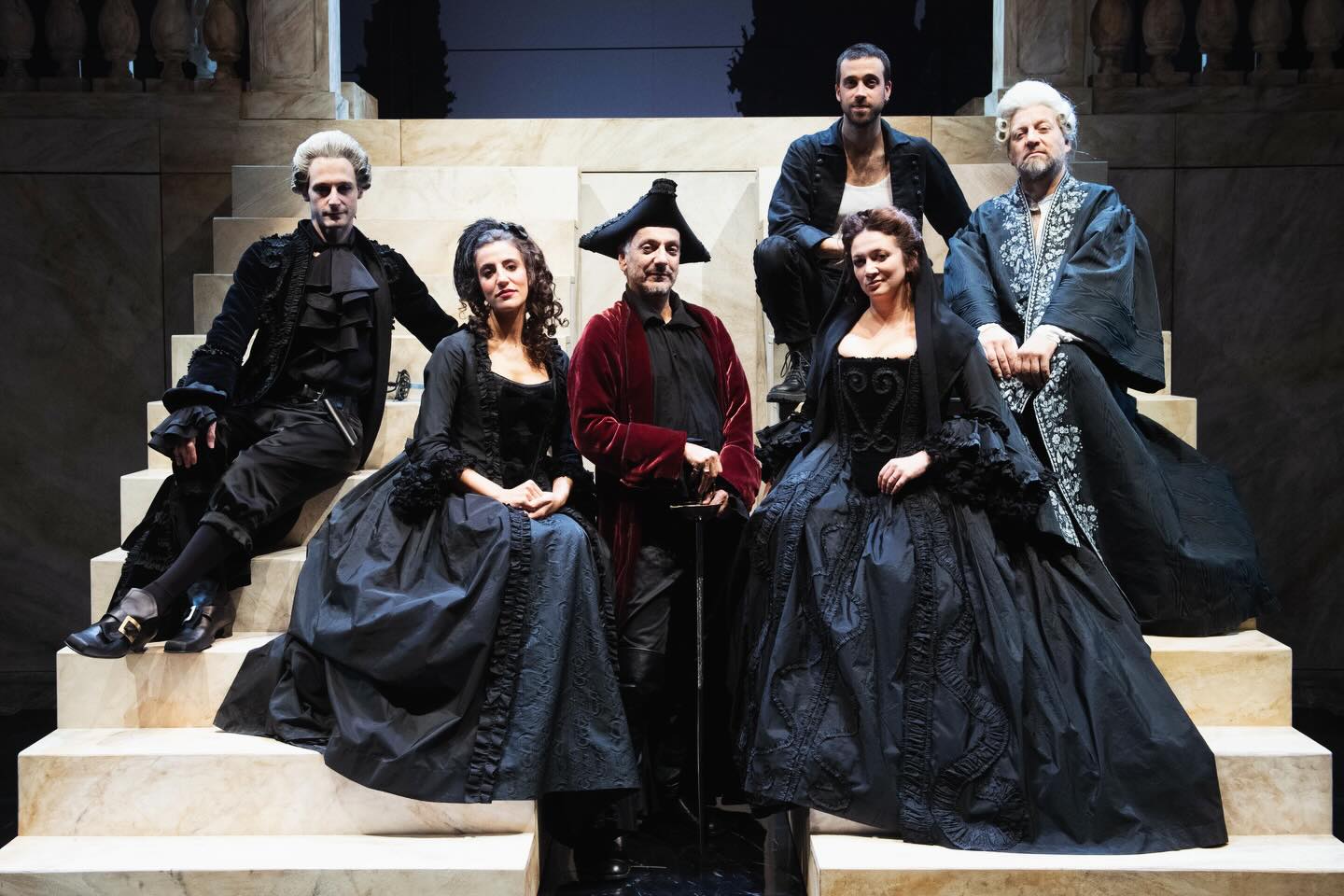 L’adattamento di Cirillo comprende parti del testo di Molière alternate ad altre tratte dal libretto di Da Ponte per l’opera di Mozart, con un passaggio repentino dalla prosa ai versi scanditi sulla musica originale. Non esattamente un recitativo da opera lirica, ma una recitazione musicale, con tanto di voci all’unisono, scambi ritmati e, talvolta, accenni cantati. In una scena neoclassica e un po’ metafisica (di Dario Gessati), dominata da una scalinata che porta ad una balconata ornata da due statue, l’incipit attinge al libretto di Da Ponte, con il duello danzato e mortifero di Don Giovanni con il Commendatore (padre della sedotta Donn’Anna) sulle note di Mozart. Confluisce poi nel dialogo molièriano con il servo Sganarello (un Giacomo Vigentini ottimo nel ruolo del servitore diviso tra ossequio e disprezzo) sulla seduzione come ragione di vita.