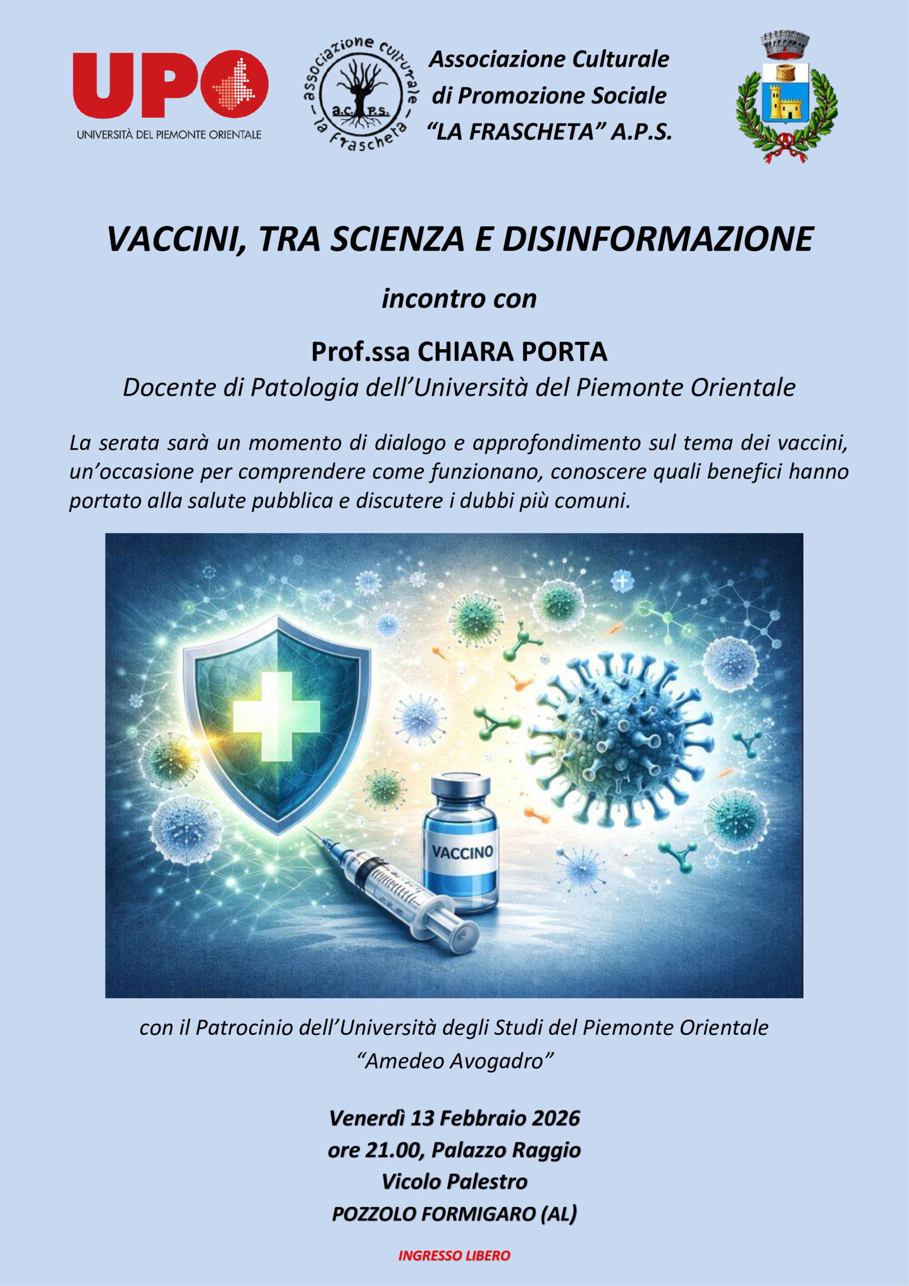 L’incontro gode del patrocinio dell’Università degli Studi del Piemonte Orientale “Amedeo Avogadro” e del Comune di Pozzolo Formigaro e vedrà come protagonista la Professoressa Chiara Porta, docente di Patologia all’UPO e membro della Società Italiana di Immunologia.