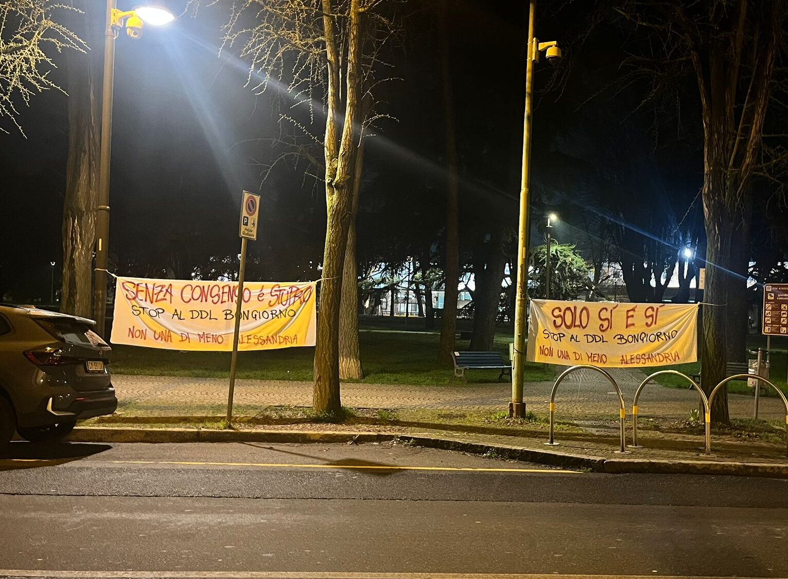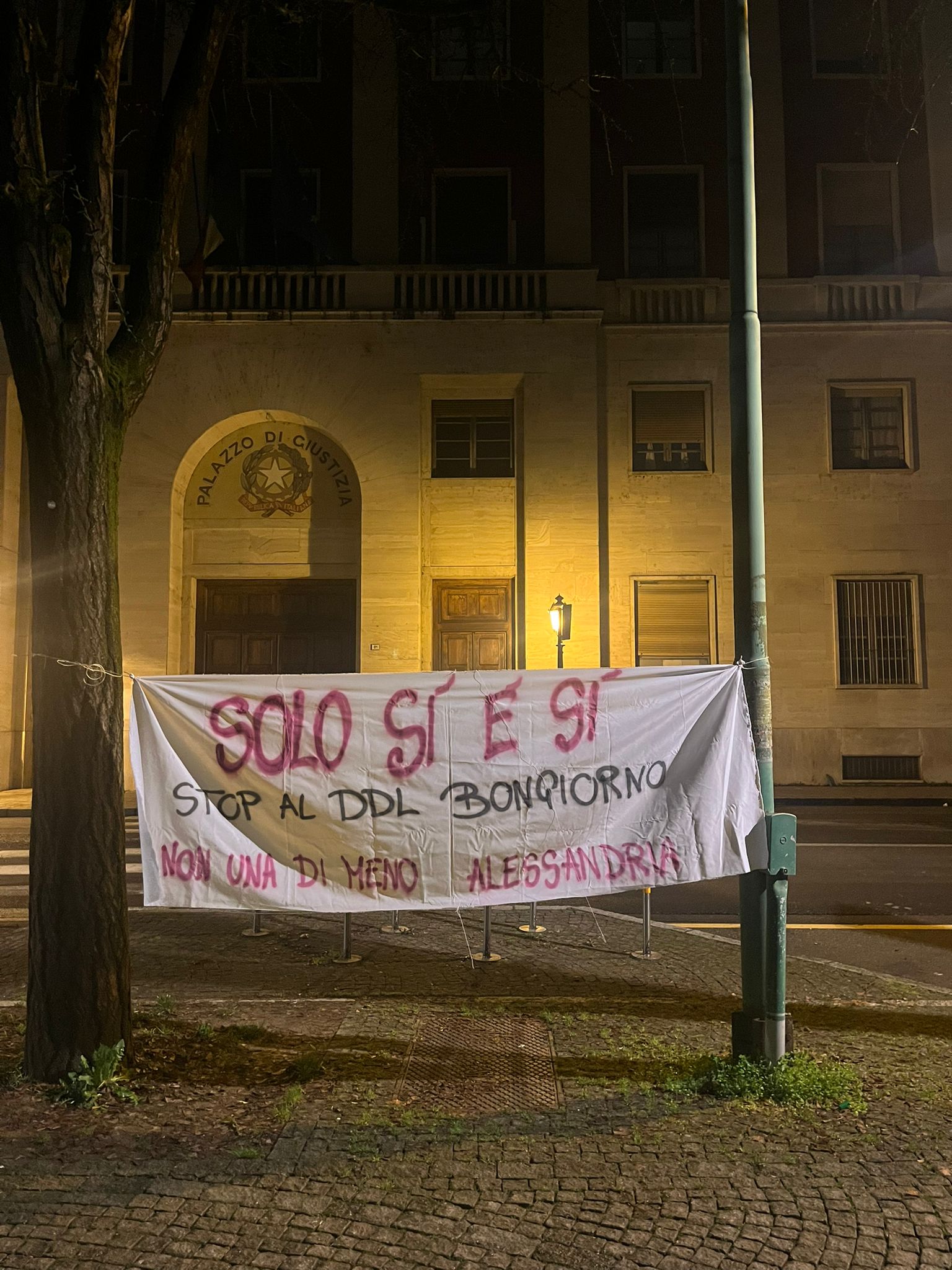 “Il governo Meloni vuole mettere in discussione il principio etico e giuridico del “solo si è si” e rimettere su banco dell’imputato la donna vittima di violenza, che deve provare di aver detto abbastanza chiaramente no. Senza consenso chiaro, attuale e libero è stupro”. Non una di meno per dare visibilità alla protesta ha affisso due striscioni all’alba, davanti al Tribunale di Alessandria. La contestazione si aggiunge alla lotta annunciata da Me.dea questa mattina.
