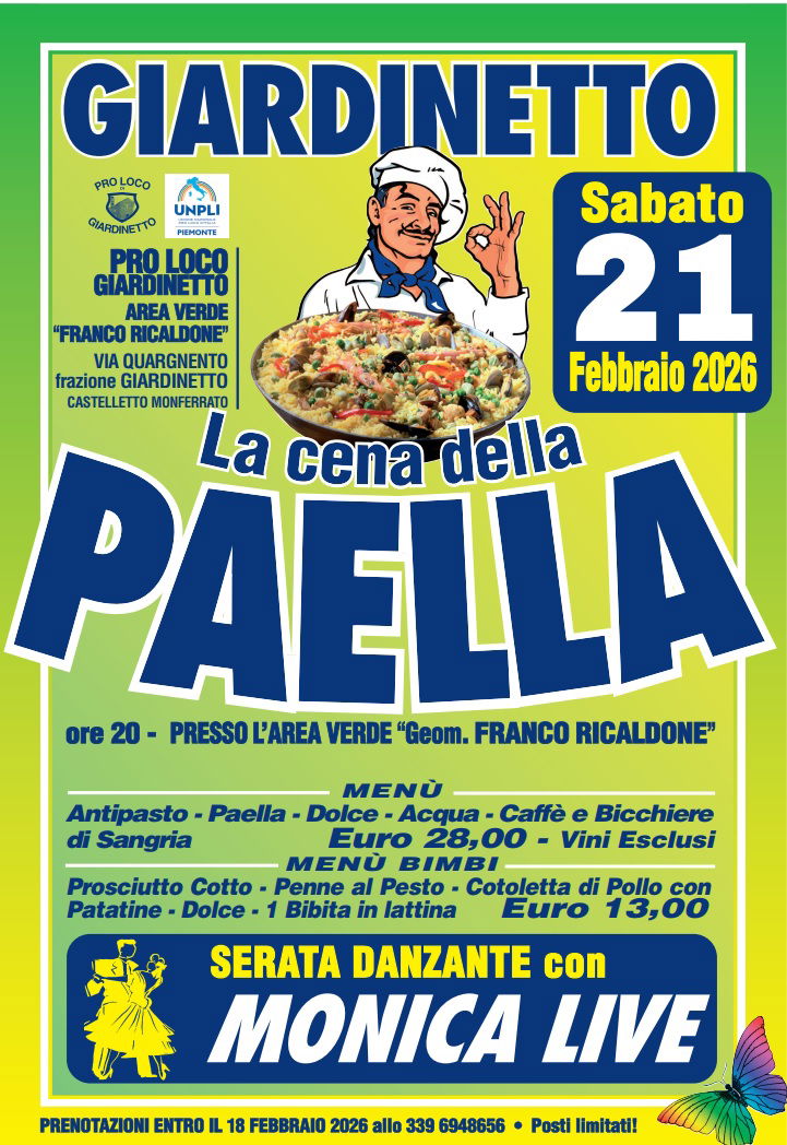 GIARDINETTO – Con la Pro Loco di Giardinetto la festa non finisce mai. Sabato 21 febbraio torna il gustoso appuntamento con la Cena della Paella nell’Area Verde “Geom. Franco Ricaldone”, in via Quargnento, frazione Giardinetto di Castelletto Monferrato.
