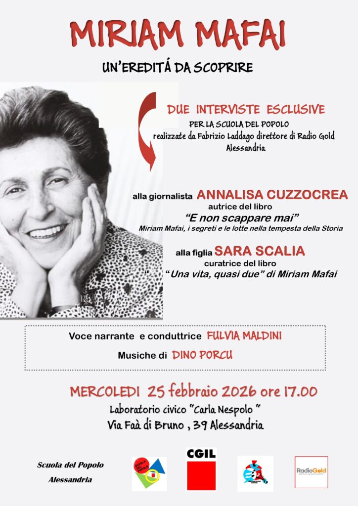 ALESSANDRIA – Mercoledì 25 febbraio 2026 al laboratorio civico “Carla Nespolo” di Alessandria, in via Faà di Bruno 39, si terrà l’incontro su Miriam Mafai, giornalista e politica. A 100 anni dalla sua nascita saranno la giornalista Annalisa Cuzzocrea, autrice del libro “E non scappare mai“, e Sara Scalia, figlia di Miriam Mafai e curatrice del libro “Una vita, quasi due“, a tracciare il profilo di una figura esempio di battaglie sociali e politiche. Dalle 17, in una videointervista, descriveranno la potenza di una donna moderna e illuminata. Condurrà il pomeriggio Fulvia Maldini che leggerà anche alcuni testi di Miriam Mafai, accompagnata dalle musiche di Dino Porcu.