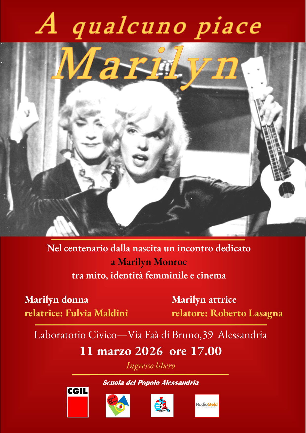 La prima parte, intitolata “Marilyn donna”, sarà affidata alla relatrice Fulvia Maldini, mentre la seconda, “Marilyn attrice”, vedrà l’intervento del relatore Roberto Lasagna, che approfondirà il percorso artistico e cinematografico dell’attrice. L’iniziativa è promossa dalla Scuola del Popolo di Alessandria con il coinvolgimento di diverse realtà associative del territorio.