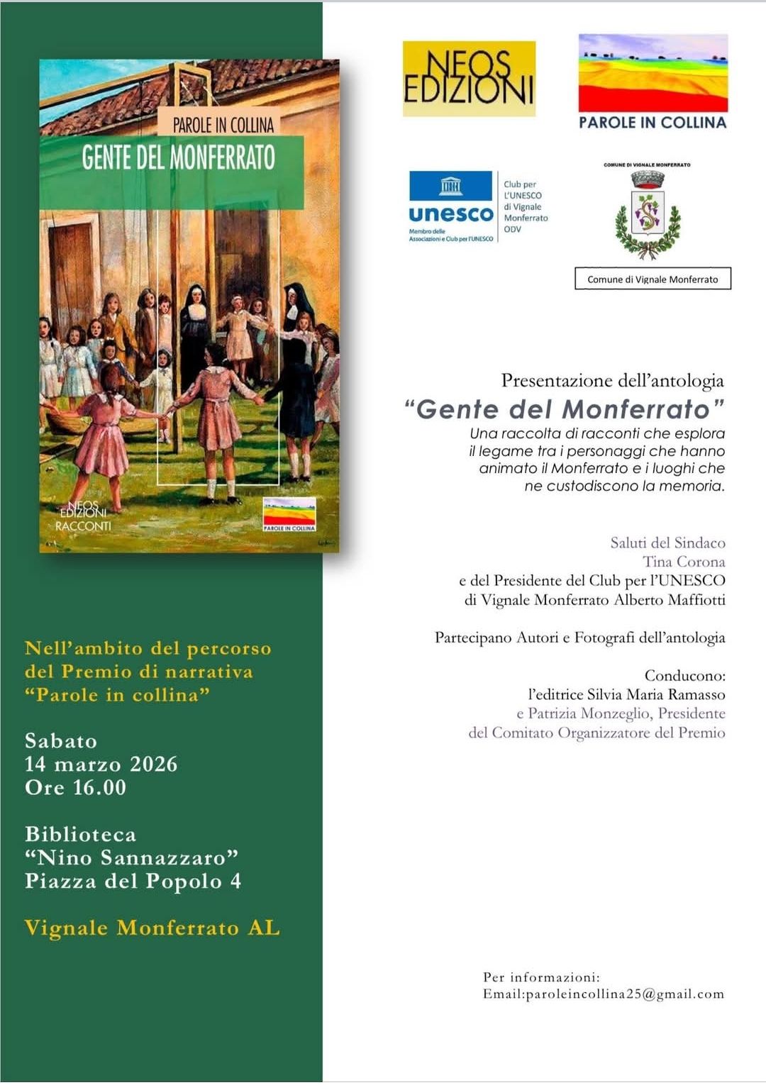 VIGNALE MONFERRATO – Sabato 14 marzo, alle 16, nella Biblioteca “Nino Sannazzaro” in piazza del Popolo 4 a Vignale Monferrato, verrà presentato “Gente del Monferrato“, una raccolta dei racconti finalisti della IV edizione del Premio “Parole in Collina 2025”. Dopo i saluti del sindaco, Tina Corona, e del Presidente del Club per l’Unesco di Vignale, Alberto Maffiotti, presenteranno il volume l’editrice Silvia Maria Ramasso e Patrizia Monzeglio, Presidente del Comitato organizzatore del premio.