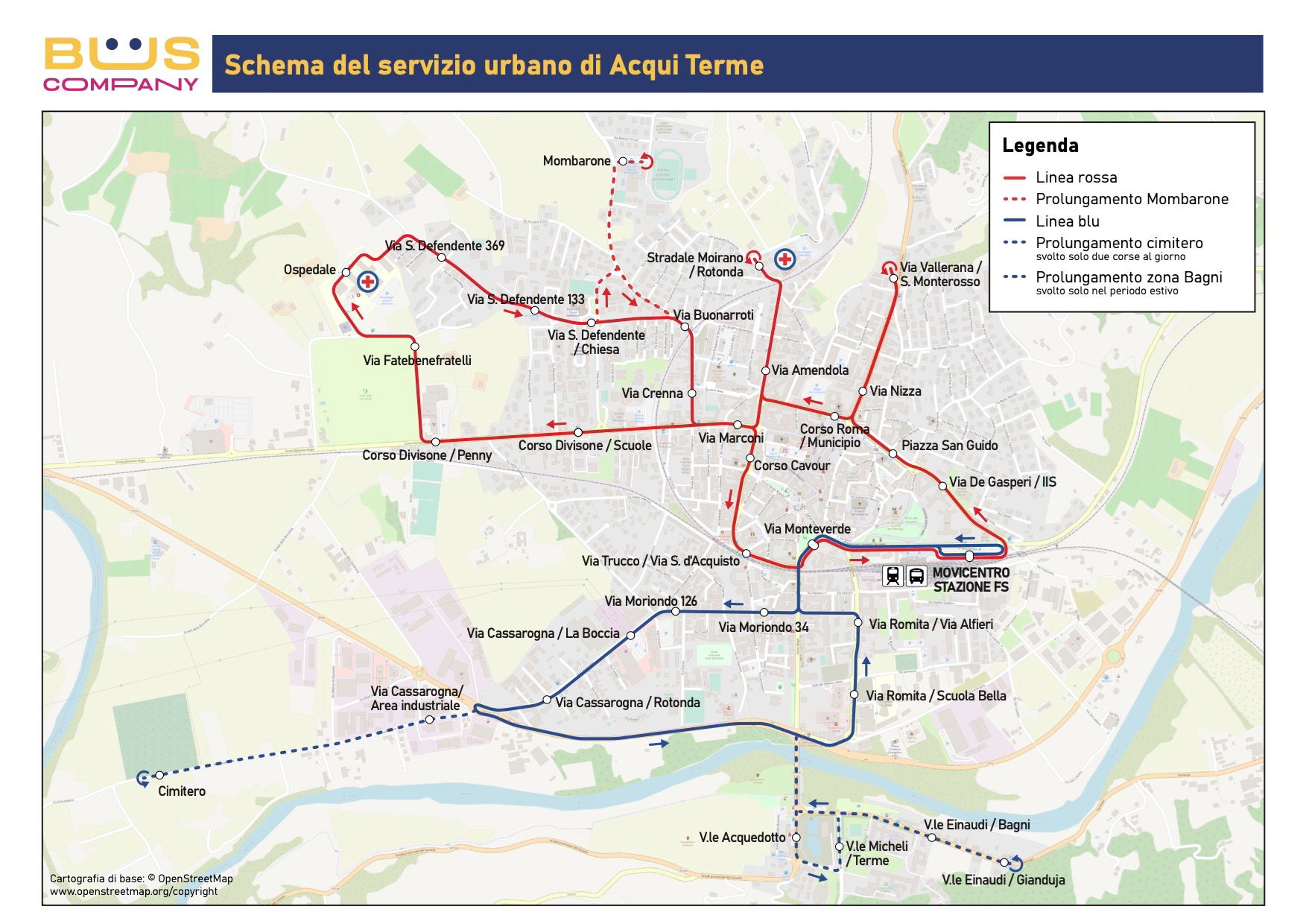 La principale novità riguarda la linea rossa. L’accorpamento di due corse consente di garantire il primo transito verso l’ospedale anche per i residenti di via Nizza con la corsa delle 7:40, rispondendo a una necessità particolarmente sentita. La corsa delle 7:20 non può infatti transitare da via Nizza perché impegnata nel servizio scolastico, con obbligo di rientro al Movicentro entro le 7:40. Tutte le restanti corse complete — ad eccezione delle 14:20 e 16:20 nei giorni scolastici, quando il mezzo deve raggiungere il Mombarone per il recupero studenti — transiteranno da via Nizza. Per le corse dirette al Mombarone è previsto solo un minimo aggiustamento di orario, senza impatti sostanziali sul servizio scolastico.