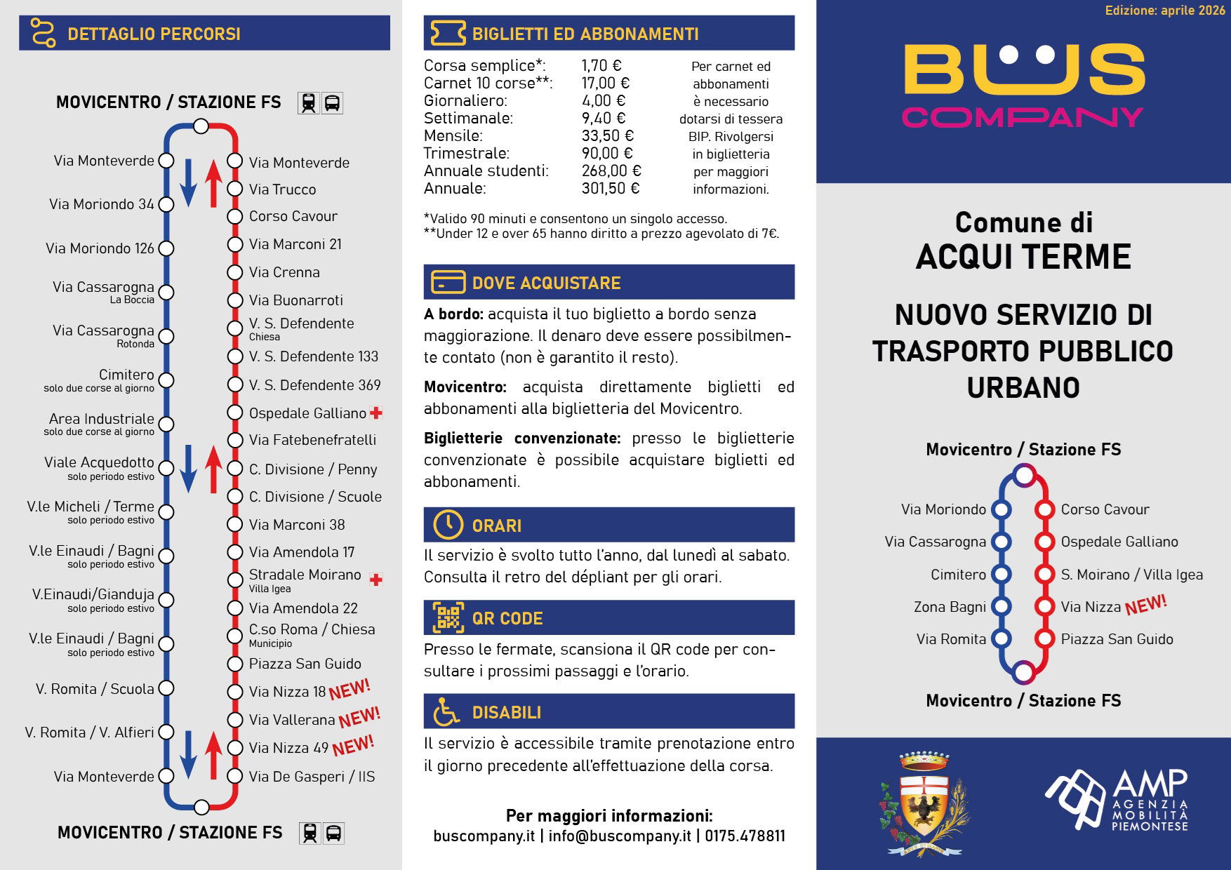 ACQUI TERME – Ad Acqui Terme cambiano alcune corse del trasporto urbano con l’obiettivo di migliorare il servizio, senza aumentare i costi complessivi. Dal prossimo 8 aprile, al termine delle vacanze pasquali, entrerà infatti in vigore la riorganizzazione delle linee Rossa e Blu, definita dopo un’analisi dei flussi di passeggeri, dei carichi e delle esigenze dei cittadini.
