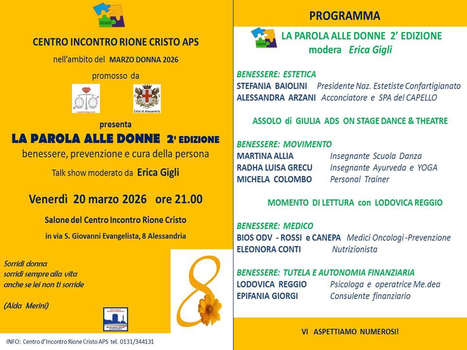 ALESSANDRIA – In occasione di “Marzo donna 2026”, venerdì 20 marzo 2026, nel salone del Centro Incontro del Cristo ad Alessandria in via San Giovanni Evangelista 8, si terrà l’appuntamento “La parola alle donne. Benessere, prevenzione e cura della persona“. Il talk show inizierà alle 21 e sarà moderato da Erica Gigli che guiderà la serata esplorando i vari aspetti del benessere femminile: