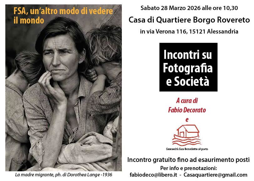 ALESSANDRIA – Sabato 28 marzo 2026, dalle 10.30, alla Casa di Quartiere ad Alessandria, appuntamento su “Fotografia e società” a cura del fotografo Fabio Decorato. Si tratta del secondo incontro di un percorso composto da un ciclo di appuntamenti, realizzato insieme con Fabio Decorato, che ha lo scopo di approfondire e far conoscere la storia della Fotografia dal 900 ai giorni nostri. L’appuntamento segue il primo e partecipato incontro sul tema.
