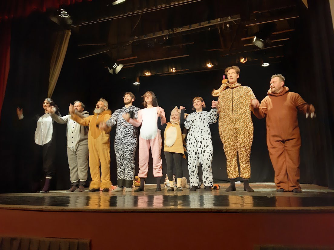 Giusy Barone, Assunta Floris, Simona Gandini, Federico Bocchio, Daniele Saliceti, Mauro Gatti, Elena Gollini, Daniele Gambera, Amedeo Zanotto danno vita ad una situazione claustrofobica di alienazione, persi nei loro personaggi di ex artisti ormai privi di aspirazioni artistiche. Tutti sono incattiviti, ma ognuno ha un suo dramma personale, che impedisce qualunque solidarietà reciproca. Alcuni sono veterani del gruppo e da decenni si identificano con le loro maschere, altri sono più giovani, ma altrettanto animalizzati. Non hanno più nomi: sono la Gatta, la Cagnolina, la Riccia, il Leone, la Zebra…e, agli ordini della voce fuori campo di un regista dittatoriale, cantano canzoncine melense, ballano, si fingono gioiosi e amorevoli, per sbranarsi come in una giungla un attimo dopo.
